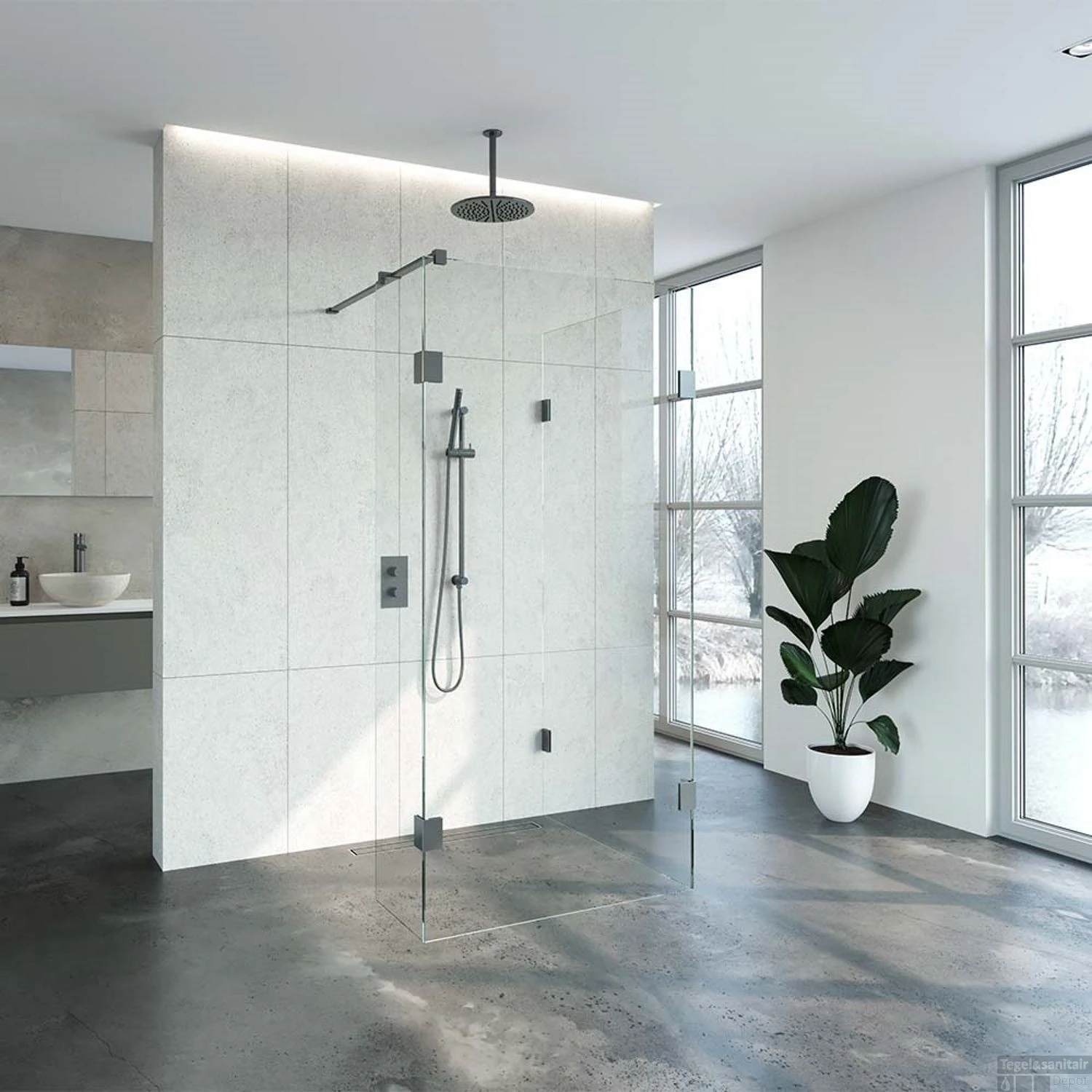 Deze complete inloopdouche bestaat uit twee inloopwanden en en een zijwand met Gunmetal beslag. Inclusief glasbehandeling. De hoogte van de inloopdouche is 200 cm. Hij is 98,3 cm breed en 97,7 cm diep. Deze inloopdouche straalt luxe uit door zijn design en kleur.