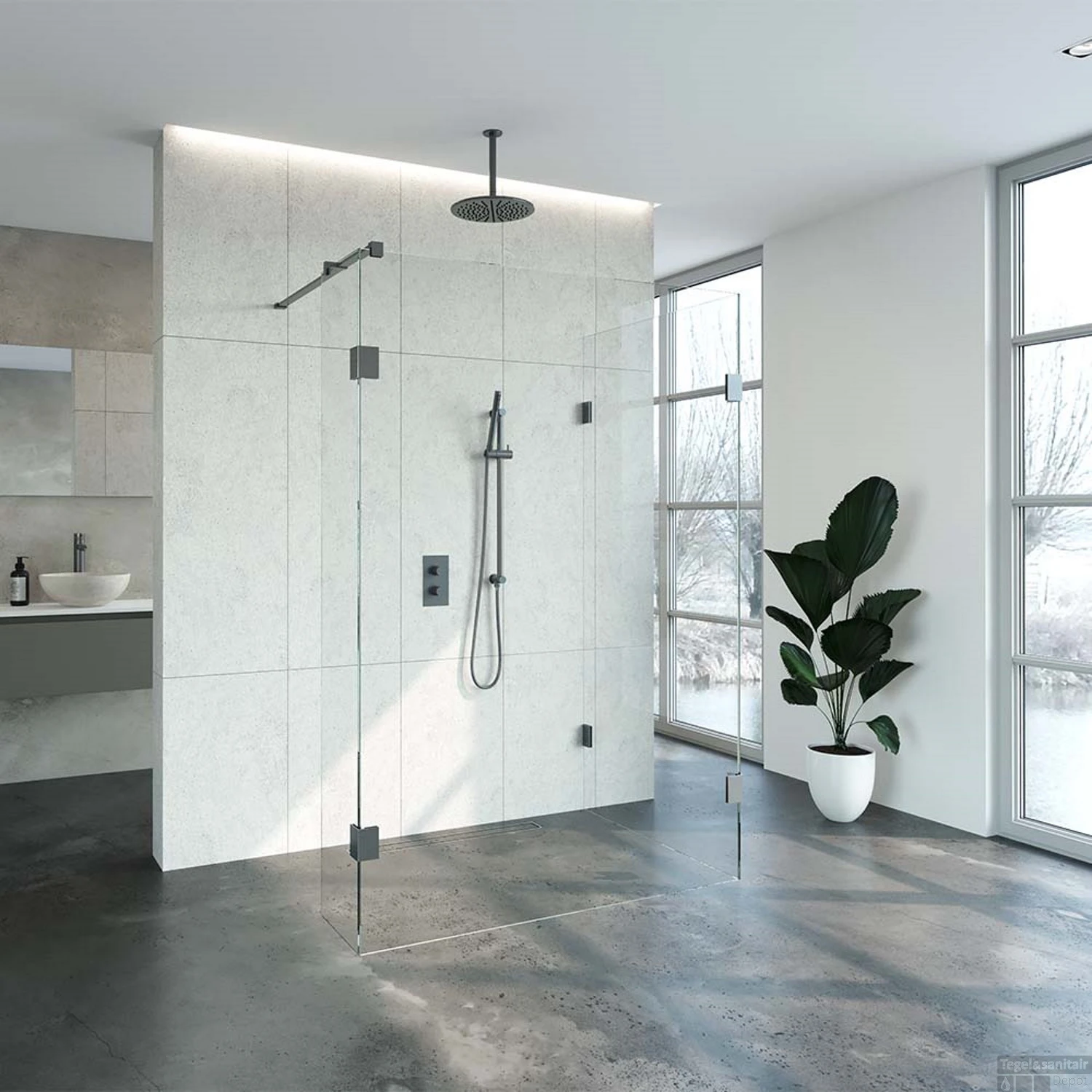 Deze complete inloopdouche bestaat uit twee inloopwanden en en een zijwand met Gunmetal beslag. Inclusief glasbehandeling. De hoogte van de inloopdouche is 200 cm. Hij is 98,3 cm breed en 97,7 cm diep. Deze inloopdouche straalt luxe uit door zijn design en kleur.