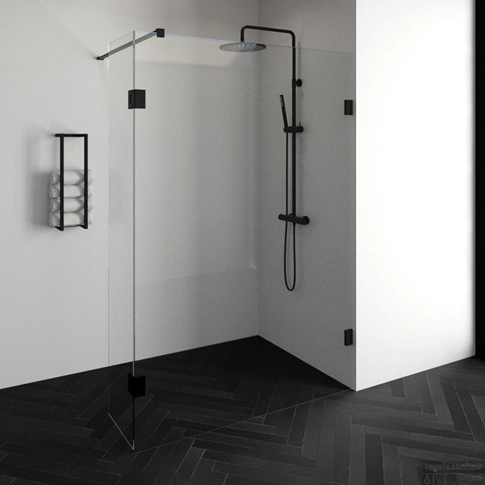 Deze complete inloopdouche bestaat uit een inloopwand en een draaibare zijwand met Mat Zwart beslag. Inclusief glasbehandeling en optionele kunststof profielen. De hoogte van de inloopdouche is 200 cm. Hij is 137,7 cm breed en maximaal 200 cm diep. Deze inloopdouche straalt luxe uit door zijn design en kleur.