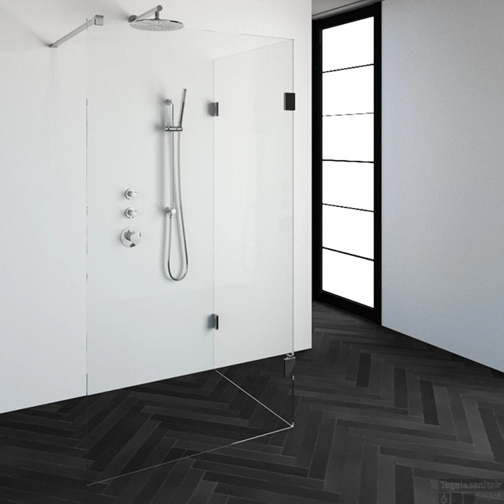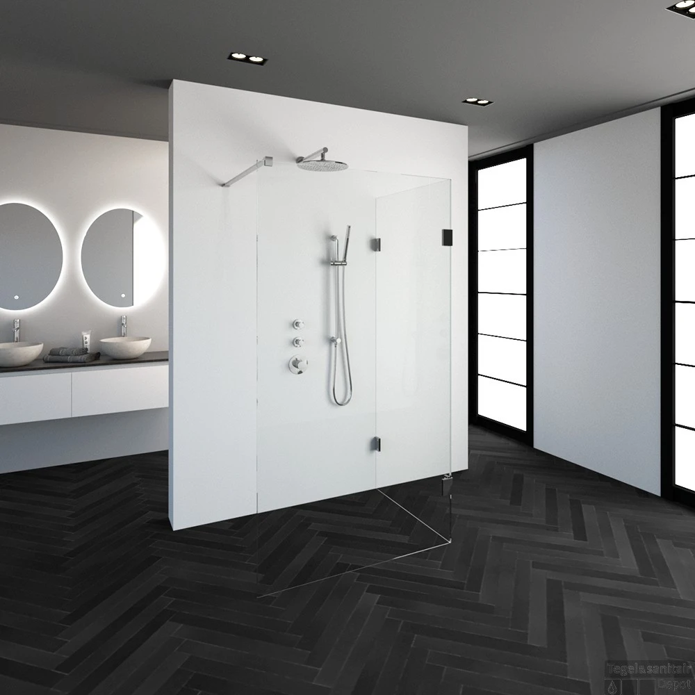 Deze complete inloopdouche bestaat uit twee inloopwanden met Chroom beslag. Inclusief glasbehandeling. De hoogte van de inloopdouche is 200 cm. Hij is 108,3 cm breed en 87,7 cm diep. Deze inloopdouche straalt luxe uit door zijn design en kleur.