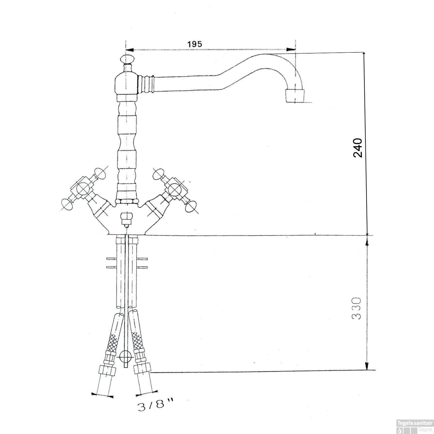 De uitloop heeft een hoogte van 17.5 cm en een lengte van 19.5 cm. De mengkraan is voorzien van een 3/8 inch aansluiting.