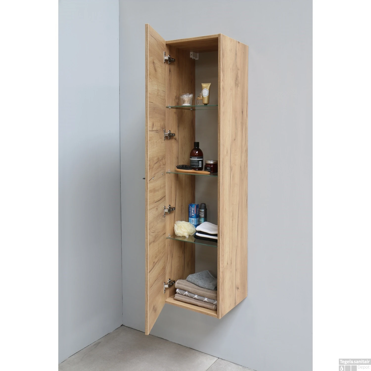 Deze mooie kolomkast uit de serie Salt is van het merk BWS. De hoogte van deze kolomkast is 150 cm, de breedte is 35 cm en de diepte is 35 cm. De kolomkast is gemaakt van melamine in de kleur Whisky Oak. De greep van deze kolomkast kunt u kiezen, u kunt kiezen uit een chromen of een zwarte greep. De deur van de kolomkast is voorzien van softclose. De kolomkast is voorzien van 3 glazen legplaten waar u uw handdoeken en dergelijken op kunt plaatsen.