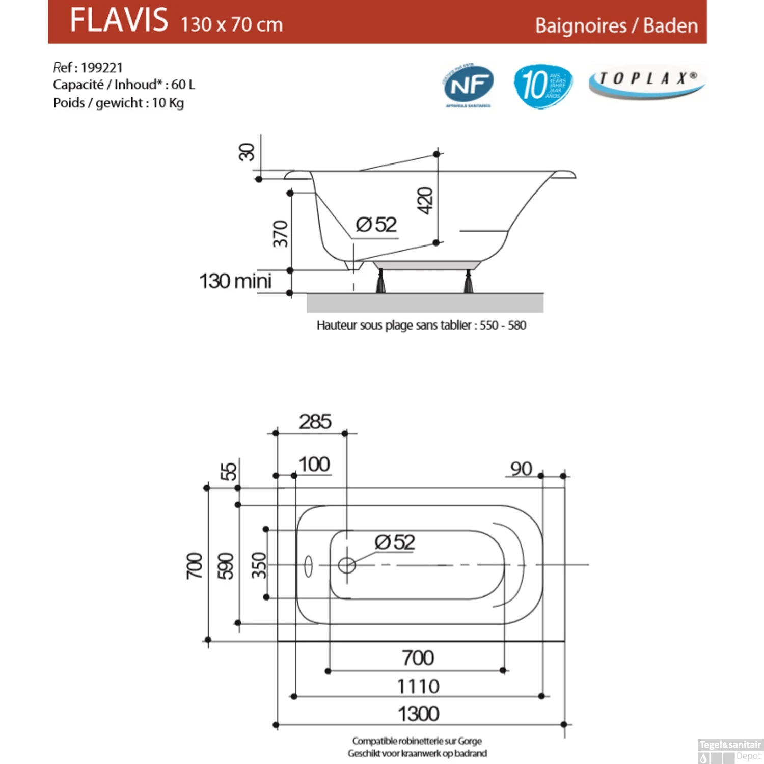 De ligbad Flavis van Allibert is een rustig bad dat past in elke badkamerruimte. Wilt u een bad, maar is uw badkamer wat klein voor een bad. Dan is Flavis de oplossing. Het bad is, maar liefst 130 cm lang, 70 cm breed en 58 cm hoog.