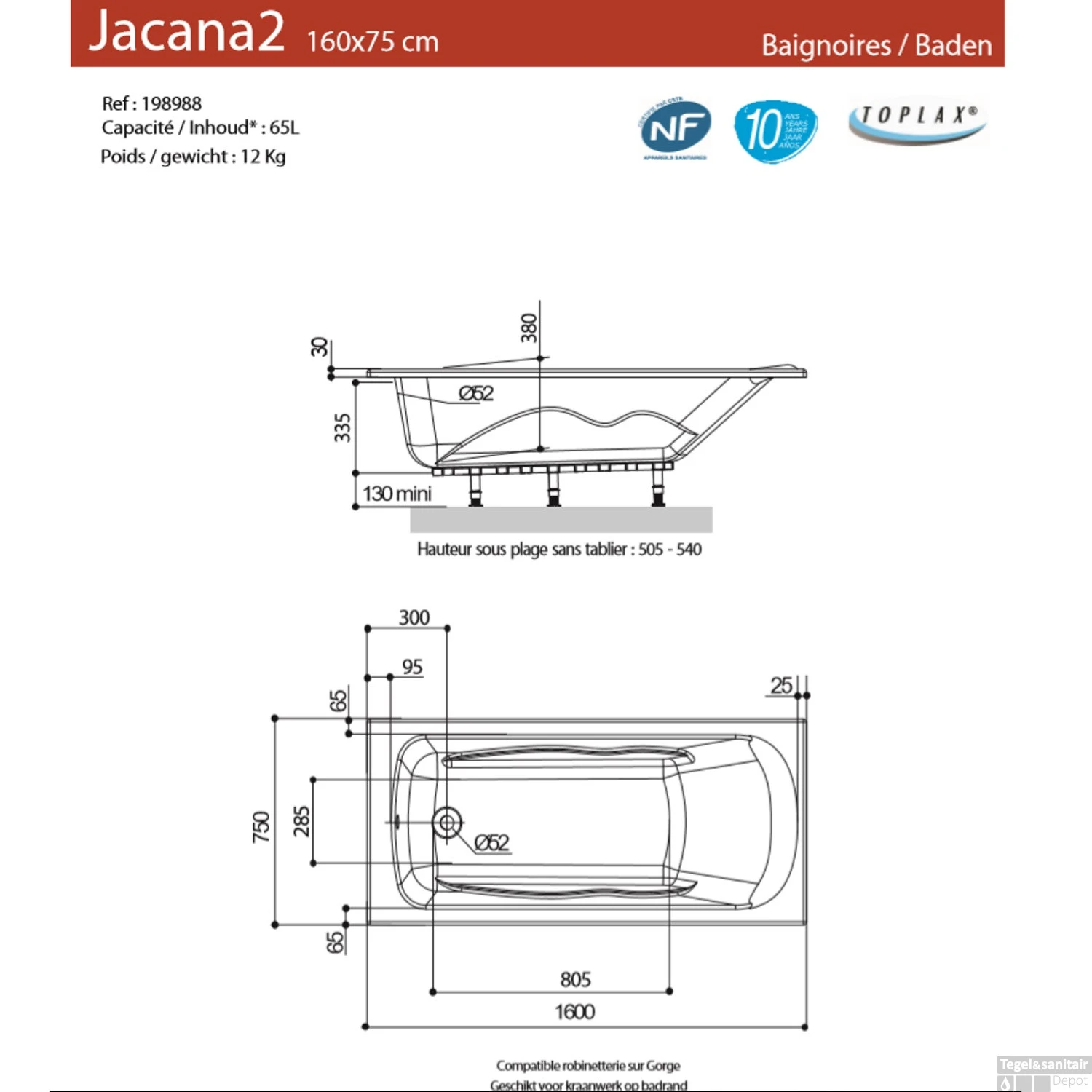 Met Ligbad Allibert Jacana 160×75 cm kunt u zich even helemaal ontspannen. Hij is namelijk voorzien van een geïntergreerd hoofdstuk en armsteunen. Het bad is helemaal gedesigned zodat u zich helemaal kunt ontspannen. De afmetingen van dit bad zijn de Lengte: 160 cm de Breedte: 75 cm de Hoogte: 52 cm en de Diepte 38.5 cm. Het volume van dit bad is 65-135 liter.