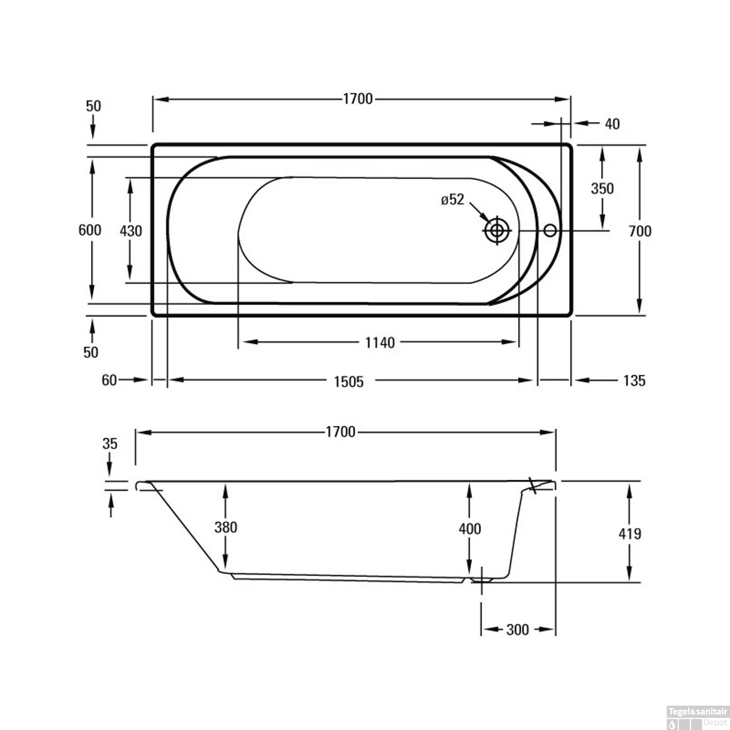 Specificaties Ligbad Plieger Flow Solo Acryl 170x70x40 met Poten Wit