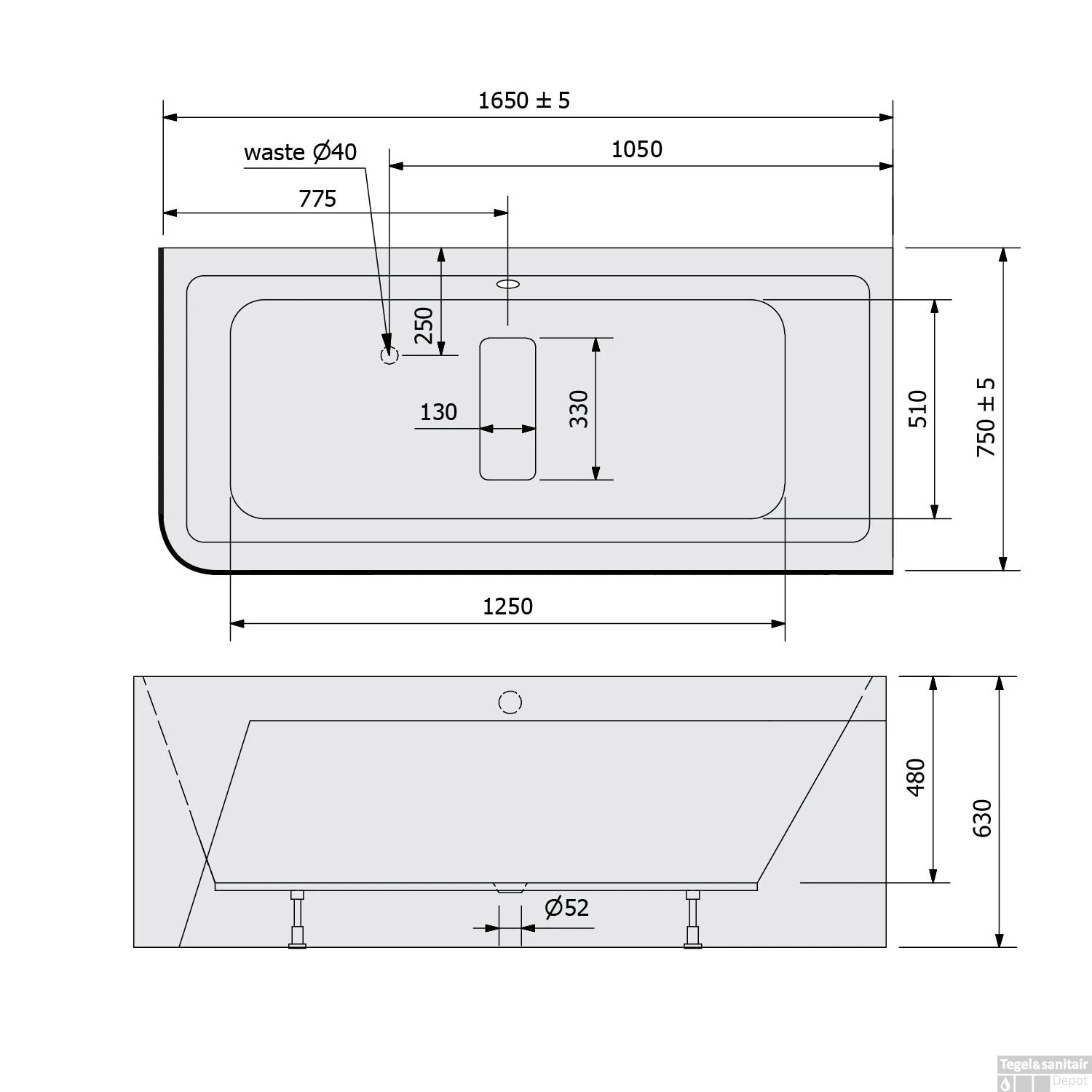 Het bad heeft een lengte van 165 cm, een breedte van 75 cm en een totale hoogte van 63 cm. De zitdiepte van het bad bedraagt 48 cm. Het bad wordt geleverd exclusief sifon en waste.