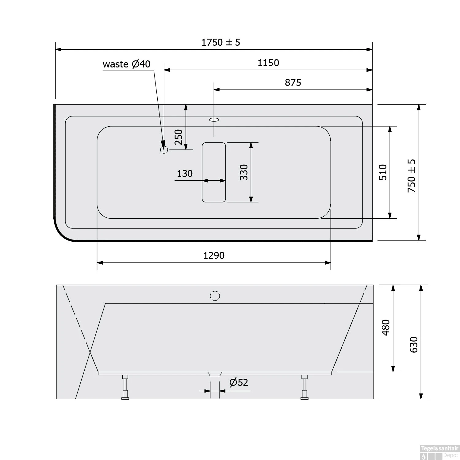 Het bad heeft een lengte van 175 cm, een breedte van 75 cm en een totale hoogte van 63 cm. De zitdiepte van het bad bedraagt 48 cm. Het bad wordt geleverd exclusief sifon en waste.