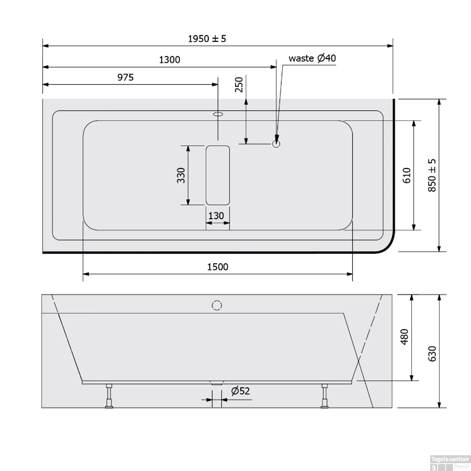 Het bad heeft een lengte van 195 cm, een breedte van 85 cm en een totale hoogte van 63 cm. De zitdiepte van het bad bedraagt 48 cm. Het bad wordt geleverd exclusief sifon en waste.