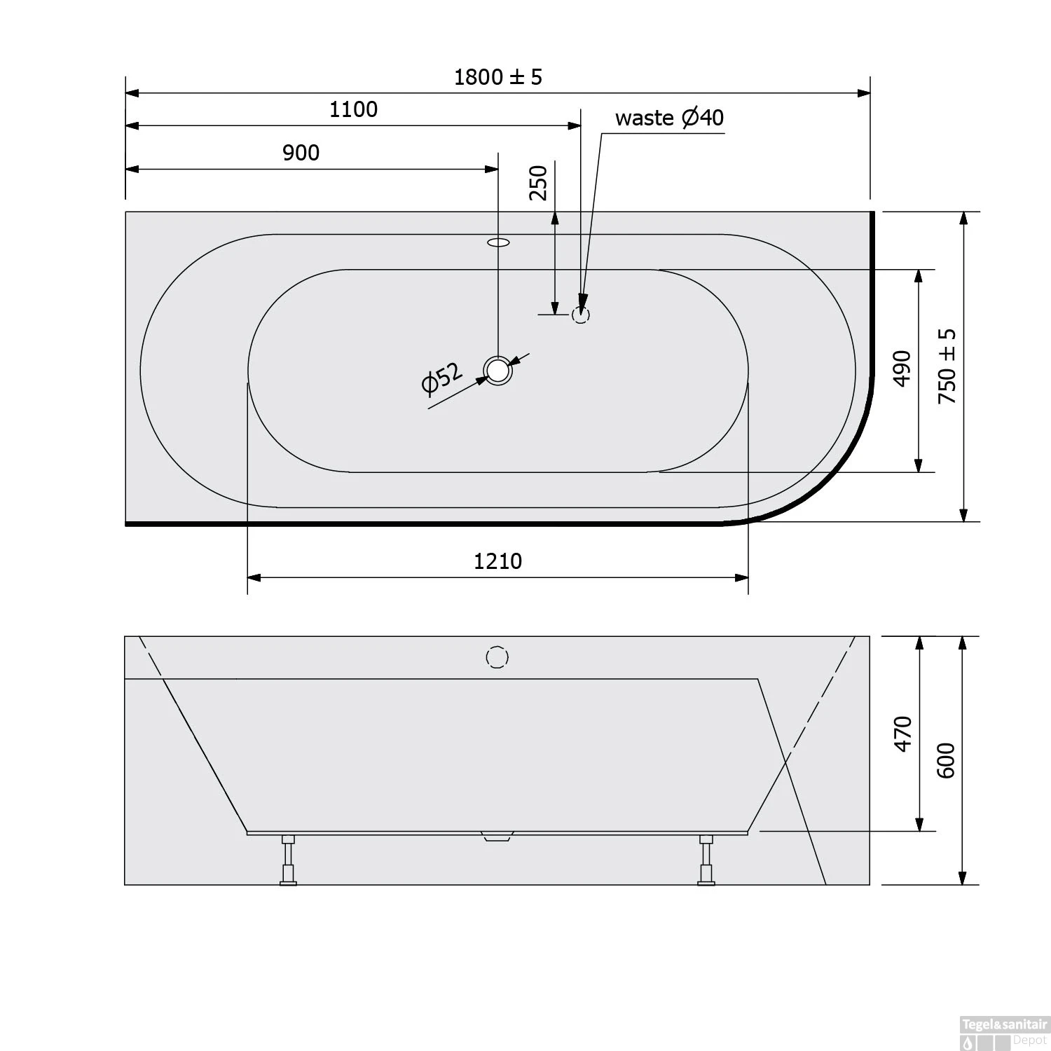 Het bad heeft een lengte van 180 cm, een breedte van 75 cm en een totale hoogte van 60 cm. De zitdiepte van het bad bedraagt 47 cm. Het bad wordt geleverd exclusief sifon en waste.