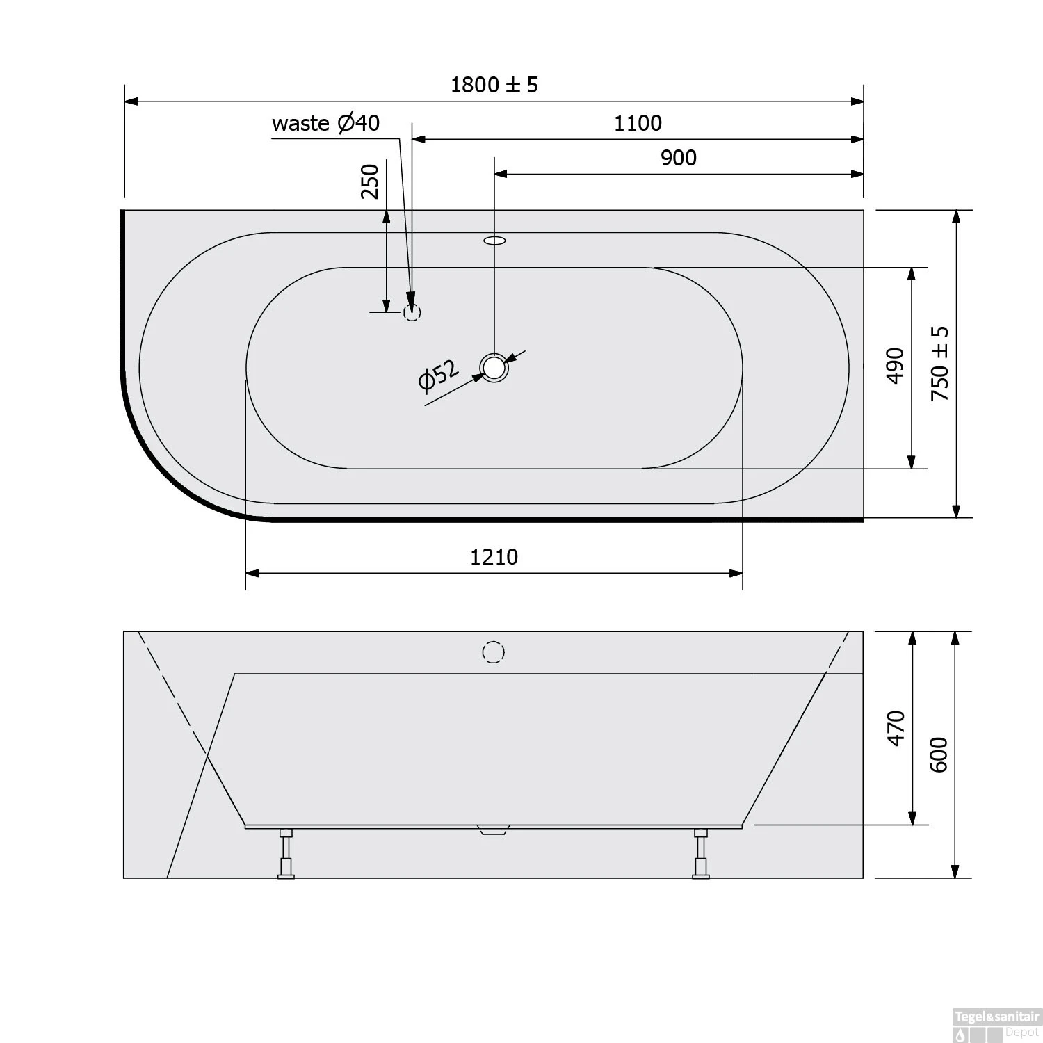 Het bad heeft een lengte van 180 cm, een breedte van 75 cm en een totale hoogte van 60 cm. De zitdiepte van het bad bedraagt 47 cm. Het bad wordt geleverd exclusief sifon en waste.