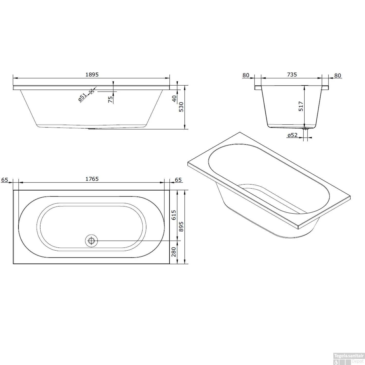 Met dit stijlvolle, ruime bad kunt u altijd genieten van een warm bad na een lange dag. Met zijn afmetingen van 190×90 cm is er plaats genoeg om erin te liggen. Het bad is 53 cm hoog. De rand heeft een dikte van 8 cm. De afvoer heeft een diameter van 5,2 cm. Dit bad wordt geleverd exclusief afvoer en badpoten.