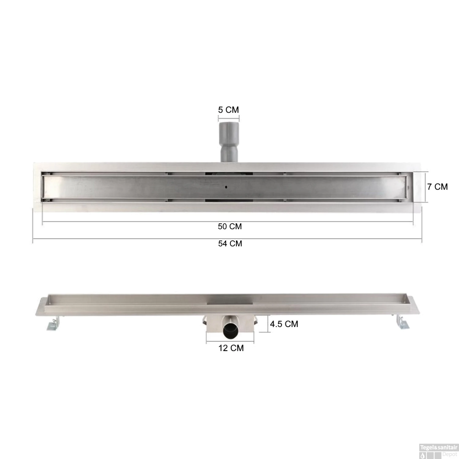De slanke goot van 50 cm is volledig gemaakt van RVS.