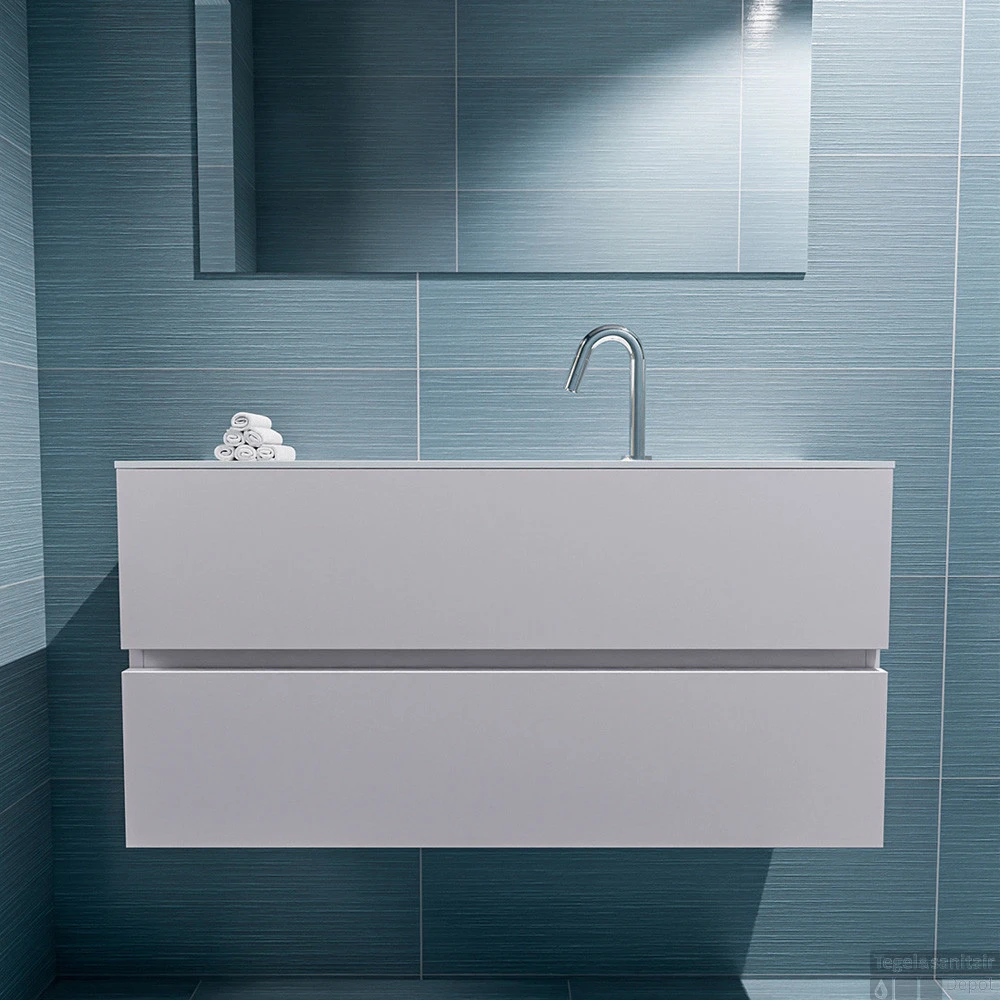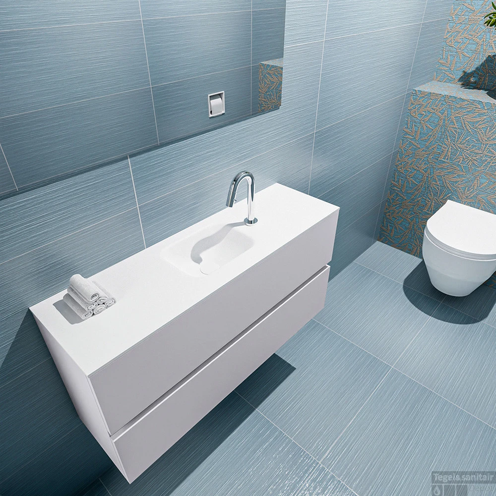 Geef jouw toilet een upgrade met de populaire toiletmeubel serie ADA! Hier zie je de vrijhangende onderkast ADA van 100cm breed met 2 lades in de kleur cale en een solid surface wastafel model LEX in de kleur Talc. De positie van de spoelbak is midden 1 kraangat. In deze toiletmeubel serie hebben wij al meer dan 600 variaties samengesteld! Daarnaast is maatwerk mogelijk.
