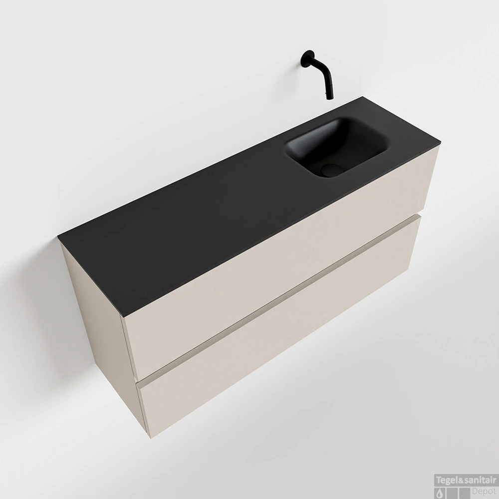 Geef jouw toilet een upgrade met de populaire toiletmeubel serie ADA! Hier zie je de vrijhangende onderkast ADA van 100cm breed met 2 lades in de kleur linen en een solid surface wastafel model LEX in de kleur Urban. De positie van de spoelbak is rechts zonder kraangat. In deze toiletmeubel serie hebben wij al meer dan 600 variaties samengesteld! Daarnaast is maatwerk mogelijk.