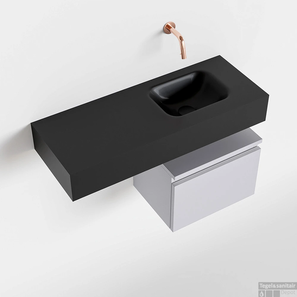 Geen ruimteverlies met deze moderne zwevende toiletmeubel ANDOR! Op de afbeelding zie je de vrijhangende wastafel LEX in 80cm breed in de kleur urban met een bijpassende badmeubel in de kleur cale. De positie van de spoelbak is rechts zonder kraangat. In deze toiletmeubel serie hebben wij al meer dan 950 variaties samengesteld! Daarnaast is maatwerk mogelijk.