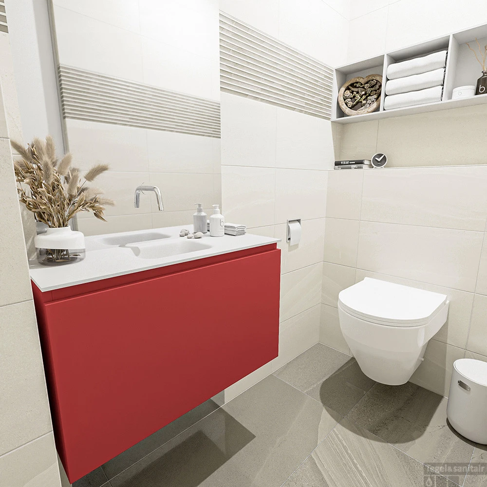 Een mooie combinatie van elegant en rustiek krijg je met het toiletmeubel OLAN! Wat je hier ziet is de vrijhangende onderkast OLAN in 80cm breed met 1 lade in de kleur fire en een solid surface wastafel model LEX in de kleur talc. De positie van de spoelbak is midden zonder kraangat. In deze toiletmeubel serie hebben wij al meer dan 680 variaties samengesteld! Daarnaast is maatwerk mogelijk.