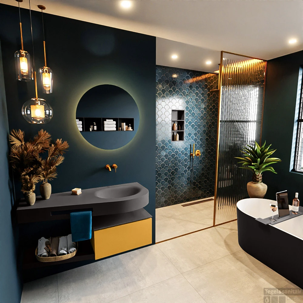Deze set staat niet alleen mooi in een luxe hotelkamer maar kan ook een fantastische blikvanger zijn in uw badkamer. De speciale vorm van de wastafel DULCET en de geïntegreerde handdoek houder zorgen ervoor dat ook in de kleinere badkamer je kunt genieten van deze hotel chique uitstraling. De badmeubel in deze afbeeldingen is de RIVA 120cm badkamermeubel met onderkast in de kleur Ocher. De RIVA heeft een vrij hangende onderkast met 1 lade waarin voldoende ruimte is voor uw badkamer spulletjes. Het solid surface planchet heeft dezelfde toelopende vorm als de wastafel. Het planchet geeft u ruimte om mooie badkamer producten te laten zien.