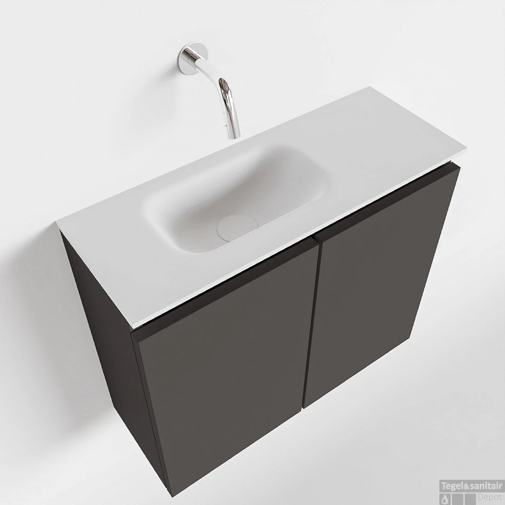 Moderniseer jouw toilet met dit toiletmeubel TURE! Het gaat hier om de vrijhangende onderkast TURE in 60cm breed met 2 deuren in de kleur dark grey en een solid surface wastafel model EDEN in de kleur talc. De positie van de spoelbak is links zonder kraangat. In deze toiletmeubel serie hebben wij al meer dan 680 variaties samengesteld! Daarnaast is maatwerk mogelijk.