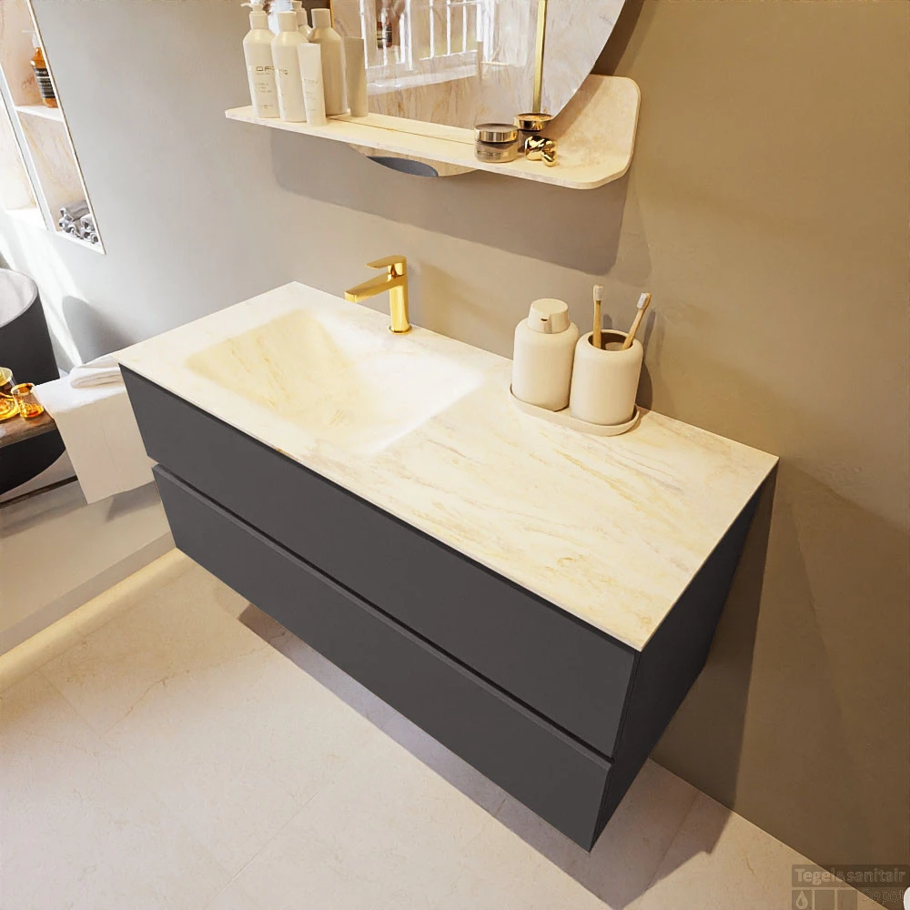De buitengewone mooie badmeubel set VICA DLUX is een schitterend pronkstuk in uw badkamer. De gemarmerde Solid Surface wastafel van CORIAN heeft een fraaie en tijdloze uitstraling. Door de zachte en natuurlijke vorm van de wastafel, gecombineerd met de tijdloze en prachtige badmeubel onderkast past de VICA-DLUX goed bij de diverse stijlen badkamers. Om uw badkamer compleet te af te stijlen hebben wij ook de nissen en spiegelhouders in dezelfde kleur als de wastafel. Zoals de nissen en spiegel planchetten. De serie VICA DLUX bestaat uit de 2 of 4 laden onderkast VICA gecombineerd met een CORIAN Solid Surface wastafel met marmer structuur. De Solid Surface CORIAN wastafel is in 5 marmer looks verkrijgbaar. Met deze badkamermeubel set heeft u wel die mooie marmeren uitstraling maar tevens ook het gemak en de hygiëne van Solid Surface.