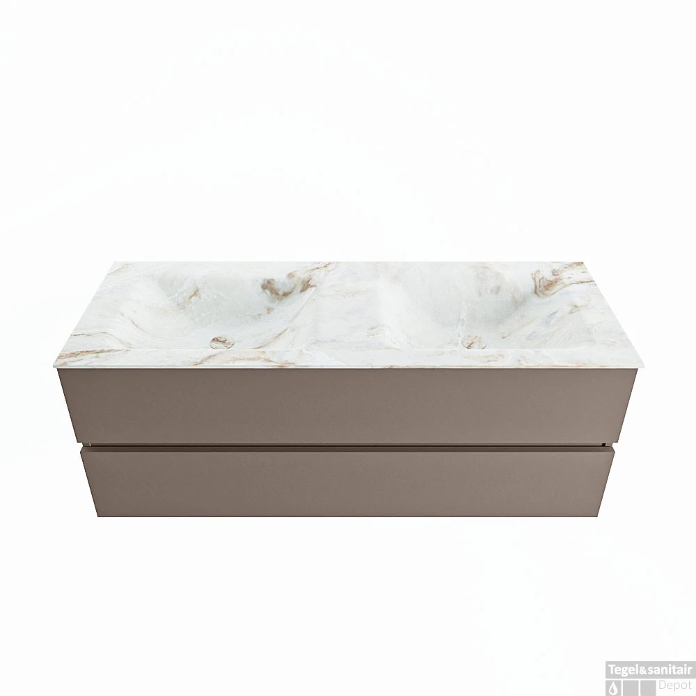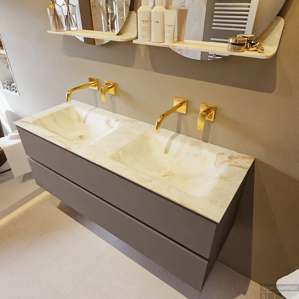 De buitengewone mooie badmeubel set VICA DLUX is een schitterend pronkstuk in uw badkamer. De gemarmerde Solid Surface wastafel van CORIAN heeft een fraaie en tijdloze uitstraling. Door de zachte en natuurlijke vorm van de wastafel, gecombineerd met de tijdloze en prachtige badmeubel onderkast past de VICA-DLUX goed bij de diverse stijlen badkamers. Om uw badkamer compleet te af te stijlen hebben wij ook de nissen en spiegelhouders in dezelfde kleur als de wastafel. Zoals de nissen en spiegel planchetten. De serie VICA DLUX bestaat uit de 2 of 4 laden onderkast VICA gecombineerd met een CORIAN Solid Surface wastafel met marmer structuur. De Solid Surface CORIAN wastafel is in 5 marmer looks verkrijgbaar. Met deze badkamermeubel set heeft u wel die mooie marmeren uitstraling maar tevens ook het gemak en de hygiëne van Solid Surface.