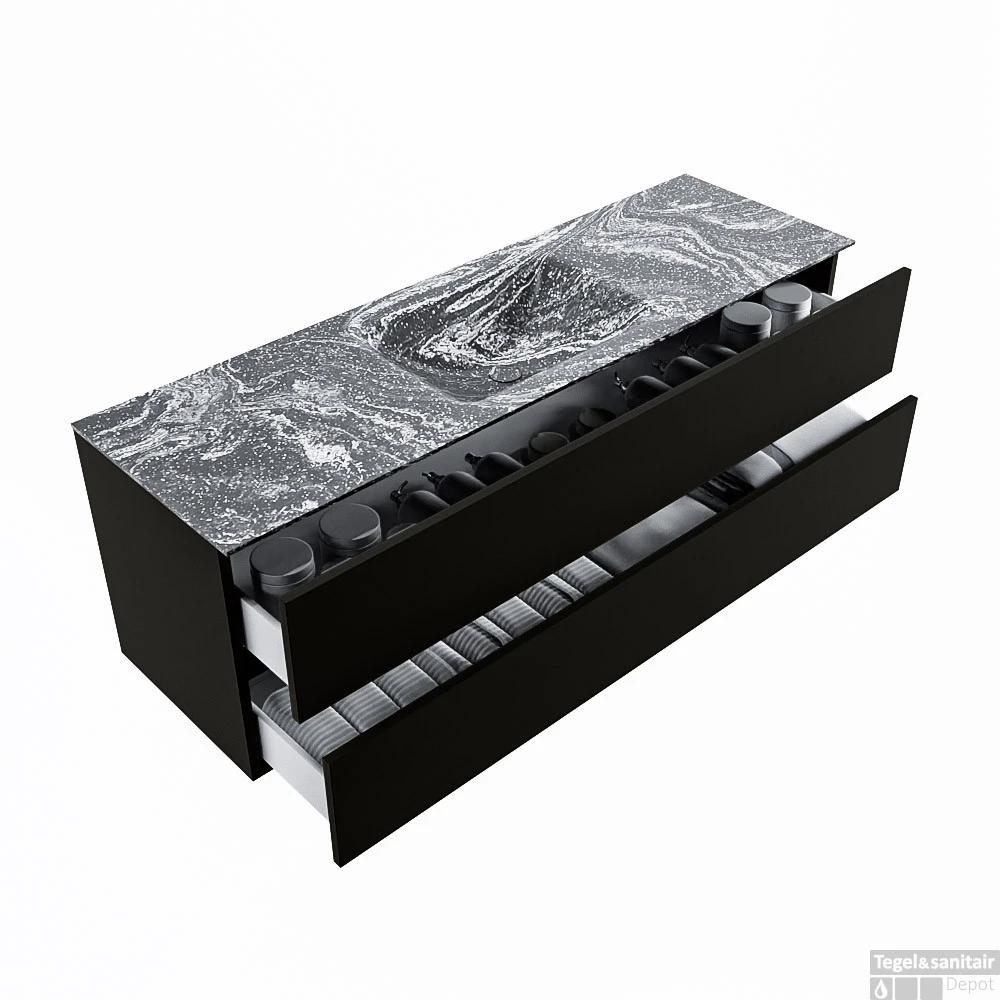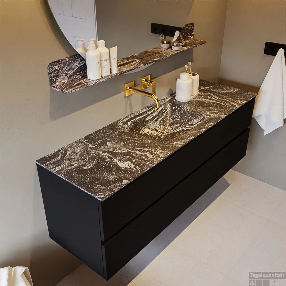 De buitengewone mooie badmeubel set VICA DLUX is een schitterend pronkstuk in uw badkamer. De gemarmerde Solid Surface wastafel van CORIAN heeft een fraaie en tijdloze uitstraling. Door de zachte en natuurlijke vorm van de wastafel, gecombineerd met de tijdloze en prachtige badmeubel onderkast past de VICA-DLUX goed bij de diverse stijlen badkamers. Om uw badkamer compleet te af te stijlen hebben wij ook de nissen en spiegelhouders in dezelfde kleur als de wastafel. Zoals de nissen en spiegel planchetten. De serie VICA DLUX bestaat uit de 2 of 4 laden onderkast VICA gecombineerd met een CORIAN Solid Surface wastafel met marmer structuur. De Solid Surface CORIAN wastafel is in 5 marmer looks verkrijgbaar. Met deze badkamermeubel set heeft u wel die mooie marmeren uitstraling maar tevens ook het gemak en de hygiëne van Solid Surface.