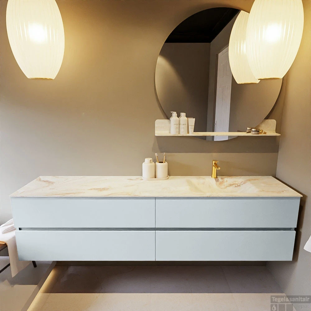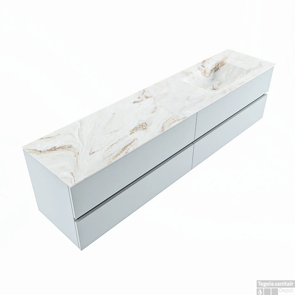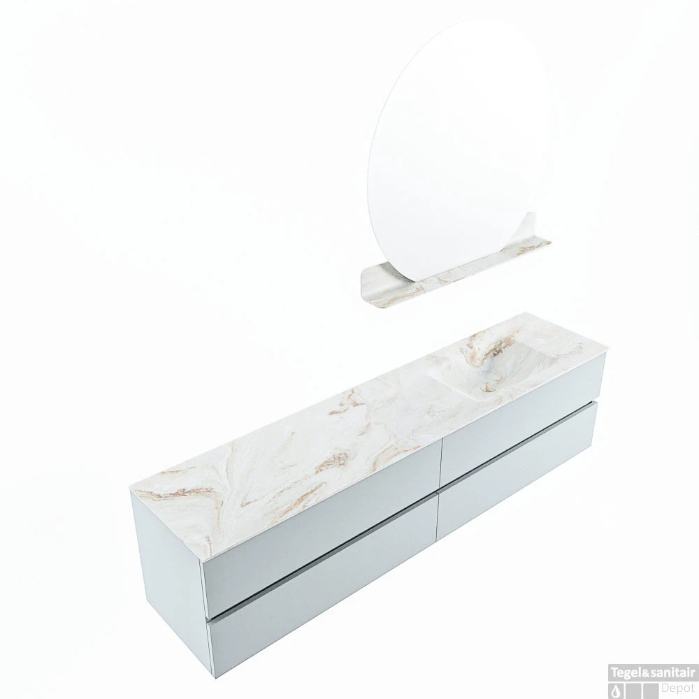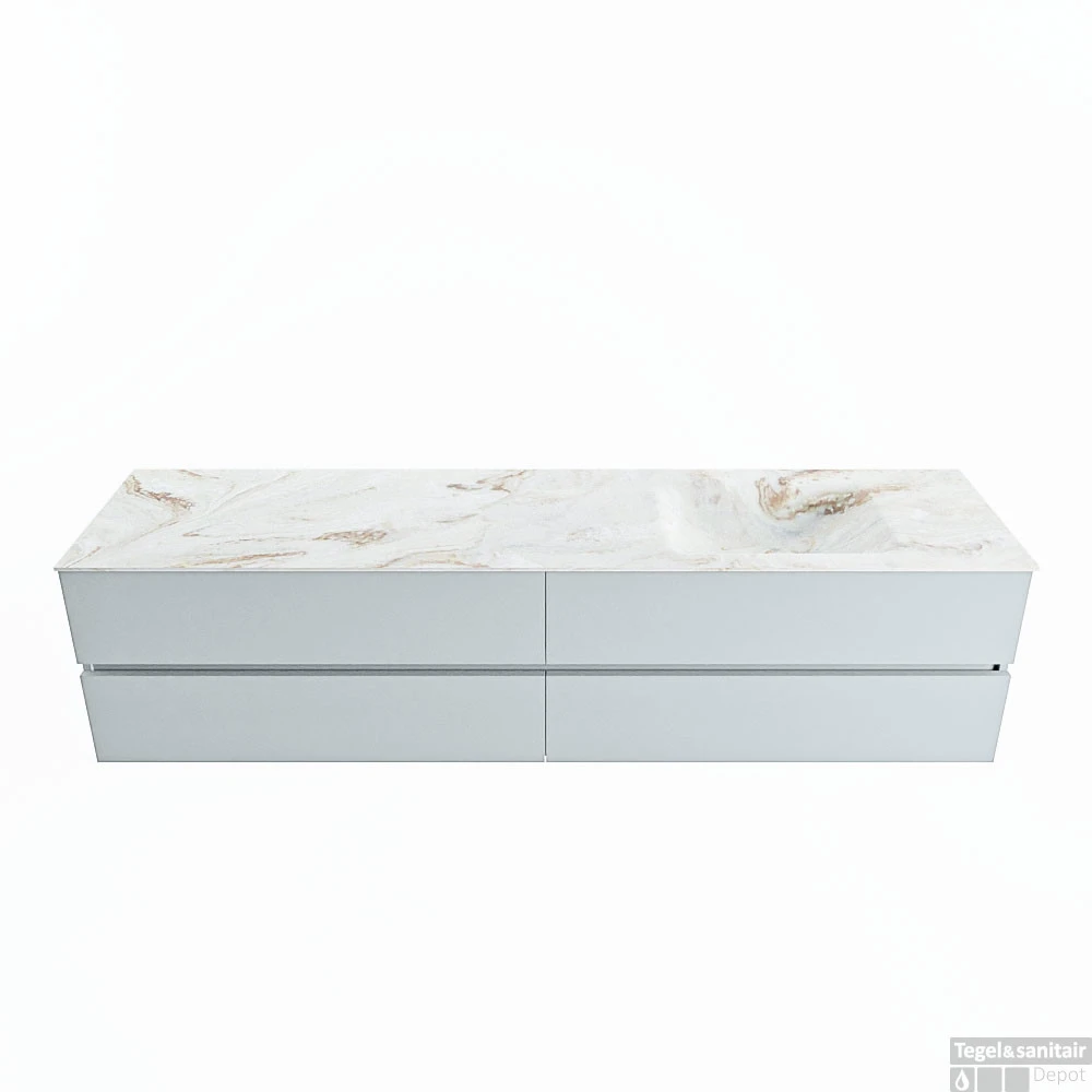 De buitengewone mooie badmeubel set VICA DLUX is een schitterend pronkstuk in uw badkamer. De gemarmerde Solid Surface wastafel van CORIAN heeft een fraaie en tijdloze uitstraling. Door de zachte en natuurlijke vorm van de wastafel, gecombineerd met de tijdloze en prachtige badmeubel onderkast past de VICA-DLUX goed bij de diverse stijlen badkamers. Om uw badkamer compleet te af te stijlen hebben wij ook de nissen en spiegelhouders in dezelfde kleur als de wastafel. Zoals de nissen en spiegel planchetten. De serie VICA DLUX bestaat uit de 2 of 4 laden onderkast VICA gecombineerd met een CORIAN Solid Surface wastafel met marmer structuur. De Solid Surface CORIAN wastafel is in 5 marmer looks verkrijgbaar. Met deze badkamermeubel set heeft u wel die mooie marmeren uitstraling maar tevens ook het gemak en de hygiëne van Solid Surface.