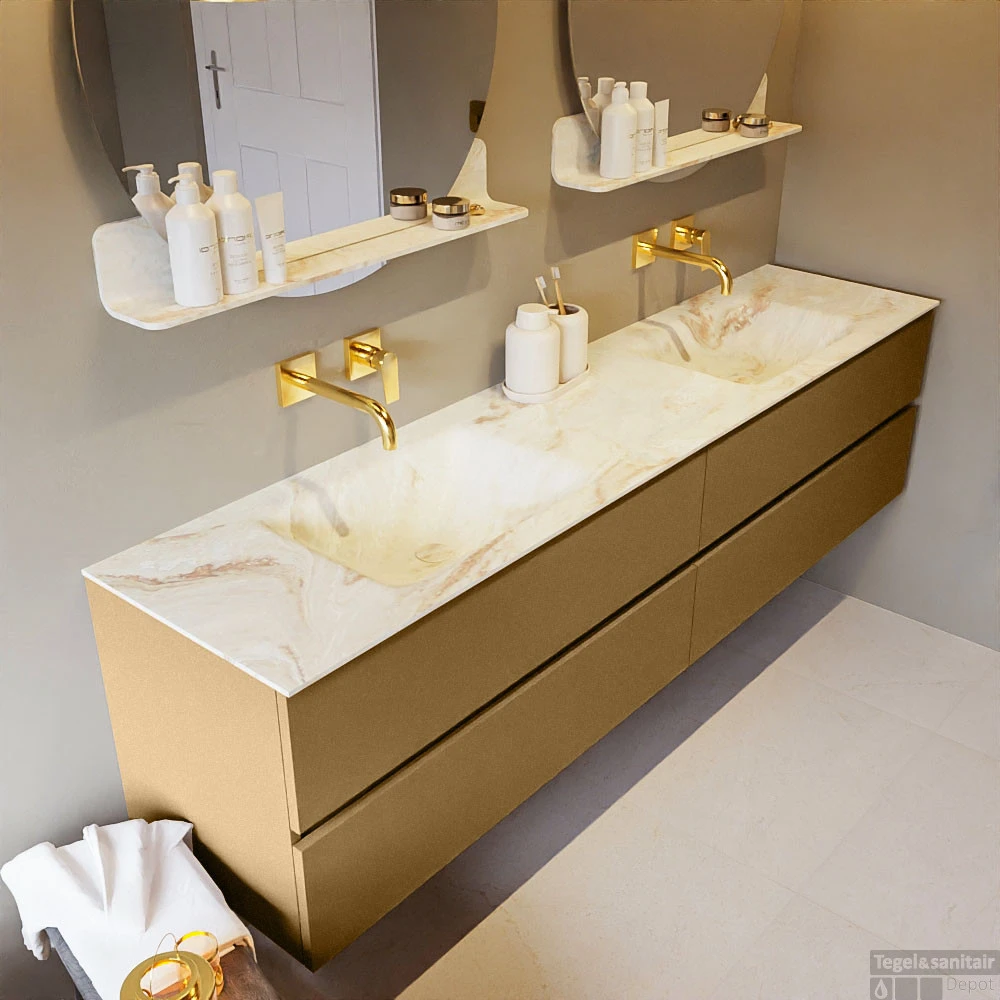 De buitengewone mooie badmeubel set VICA DLUX is een schitterend pronkstuk in uw badkamer. De gemarmerde Solid Surface wastafel van CORIAN heeft een fraaie en tijdloze uitstraling. Door de zachte en natuurlijke vorm van de wastafel, gecombineerd met de tijdloze en prachtige badmeubel onderkast past de VICA-DLUX goed bij de diverse stijlen badkamers. Om uw badkamer compleet te af te stijlen hebben wij ook de nissen en spiegelhouders in dezelfde kleur als de wastafel. Zoals de nissen en spiegel planchetten. De serie VICA DLUX bestaat uit de 2 of 4 laden onderkast VICA gecombineerd met een CORIAN Solid Surface wastafel met marmer structuur. De Solid Surface CORIAN wastafel is in 5 marmer looks verkrijgbaar. Met deze badkamermeubel set heeft u wel die mooie marmeren uitstraling maar tevens ook het gemak en de hygiëne van Solid Surface.