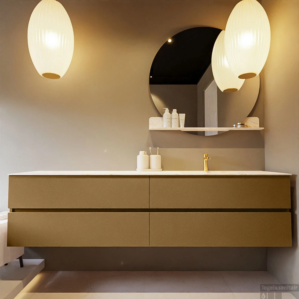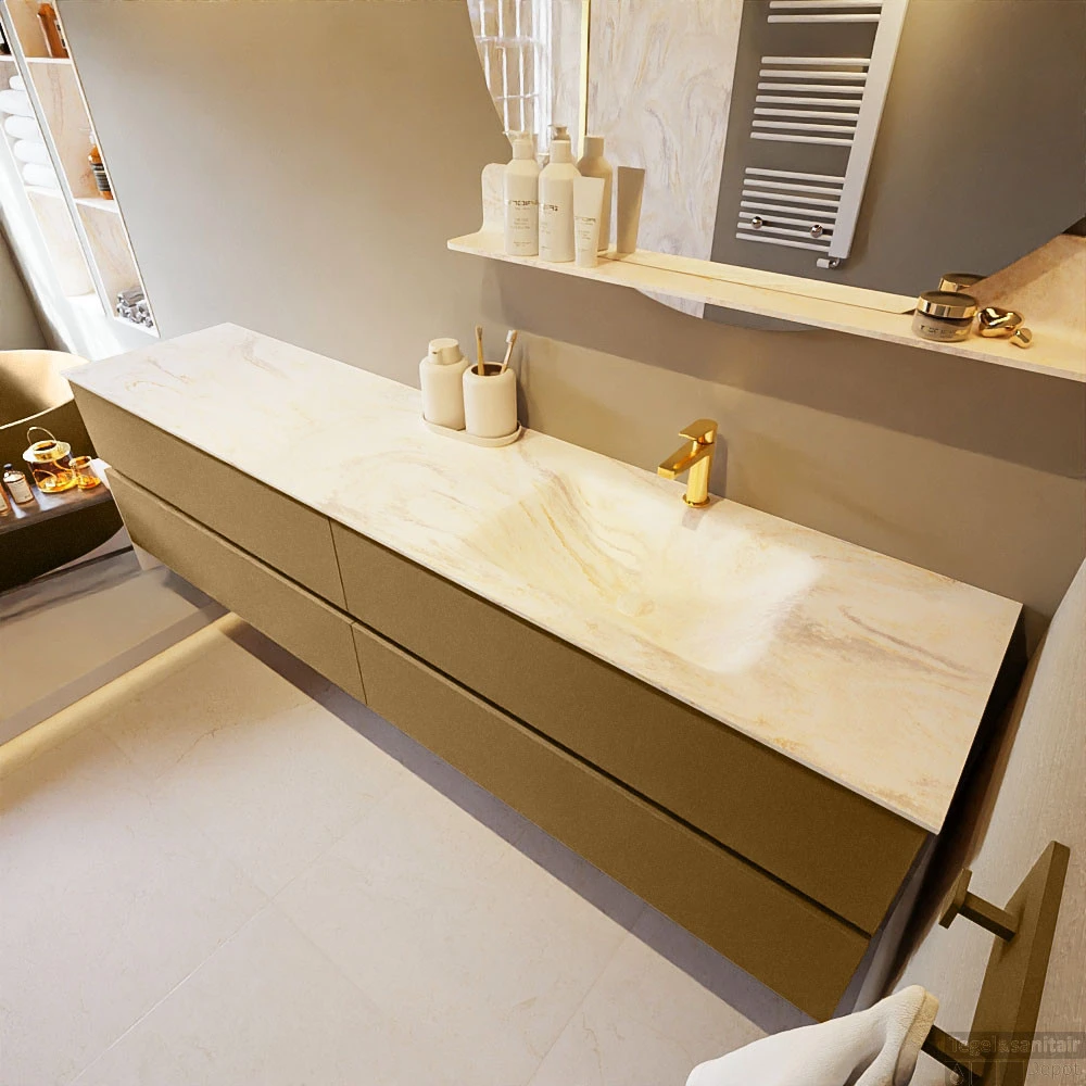 De buitengewone mooie badmeubel set VICA DLUX is een schitterend pronkstuk in uw badkamer. De gemarmerde Solid Surface wastafel van CORIAN heeft een fraaie en tijdloze uitstraling. Door de zachte en natuurlijke vorm van de wastafel, gecombineerd met de tijdloze en prachtige badmeubel onderkast past de VICA-DLUX goed bij de diverse stijlen badkamers. Om uw badkamer compleet te af te stijlen hebben wij ook de nissen en spiegelhouders in dezelfde kleur als de wastafel. Zoals de nissen en spiegel planchetten. De serie VICA DLUX bestaat uit de 2 of 4 laden onderkast VICA gecombineerd met een CORIAN Solid Surface wastafel met marmer structuur. De Solid Surface CORIAN wastafel is in 5 marmer looks verkrijgbaar. Met deze badkamermeubel set heeft u wel die mooie marmeren uitstraling maar tevens ook het gemak en de hygiëne van Solid Surface.