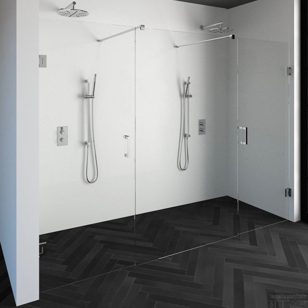 Deze complete niscabine bestaat uit een vrijstaande doorloopwand met twee draaideuren met Chroom beslag. Inclusief glasbehandeling en optionele kunststof profielen. De hoogte van de niscabine is 200 cm. Deze niscabine is modern straalt luxe uit door zijn design en kleur.