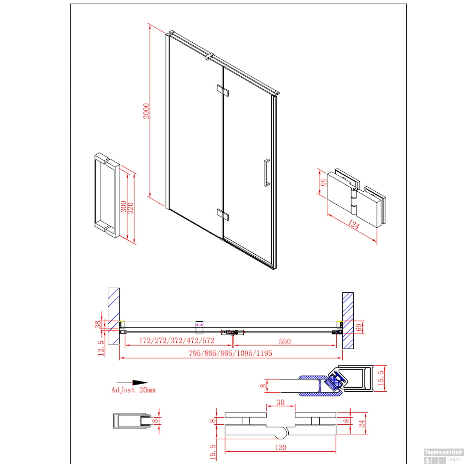 Let op: Doordat het glaswerk ook op een douchebak geplaatst kan worden zijn de afmetingen 3cm kleiner dan de aangegeven maat.