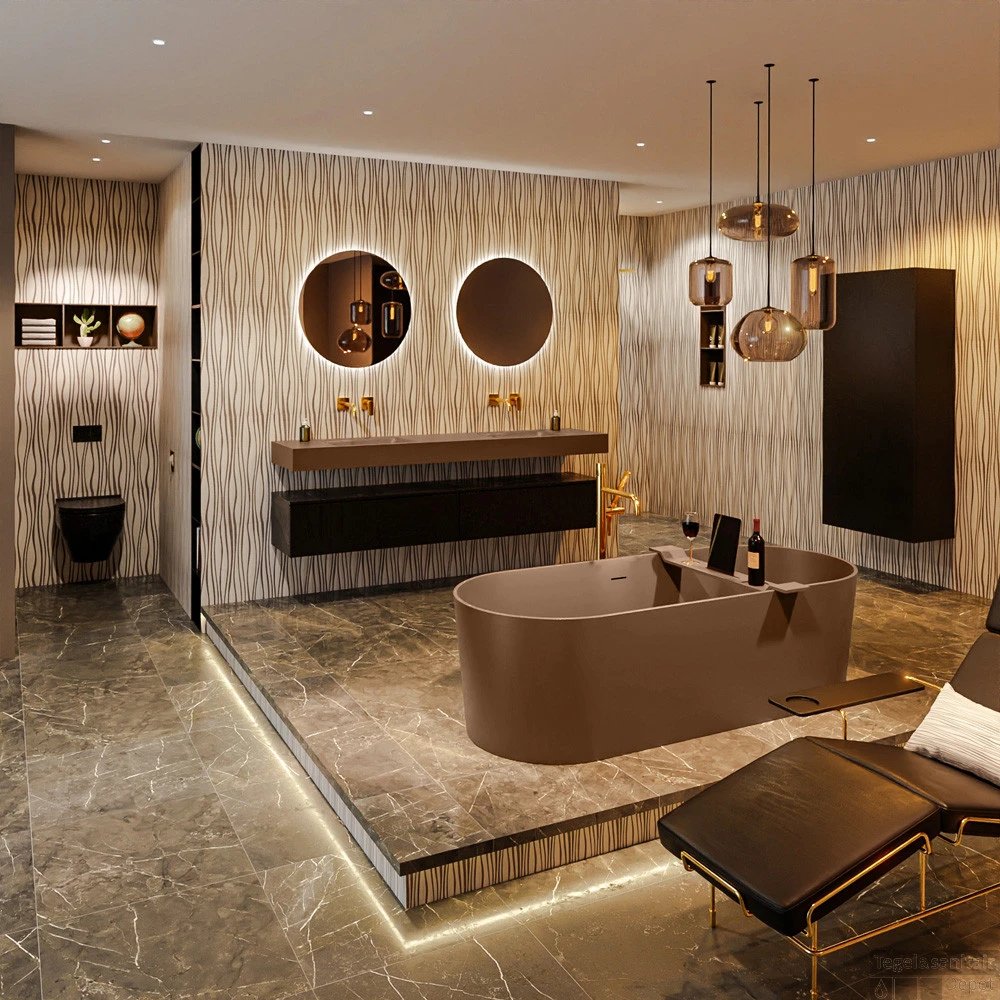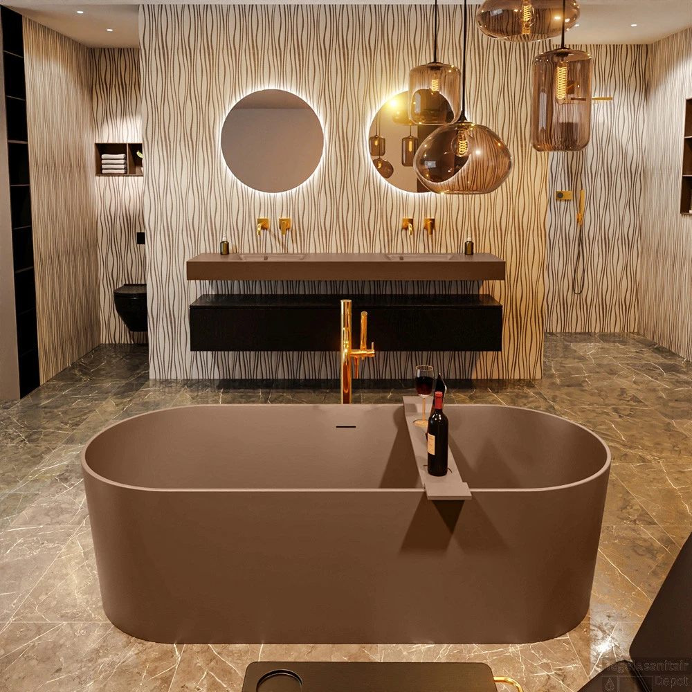 Deze chique badkamer opstelling is gecombineerd met het badmeubel ALAN. Zowel de wastafels als de meubels en nissen kunnen in dezelfde kleuren als het bad. Zo kun je jouw perfecte kleuren combinatie maken.