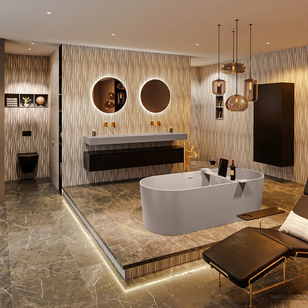 Deze chique badkamer opstelling is gecombineerd met het badmeubel ALAN. Zowel de wastafels als de meubels en nissen kunnen in dezelfde kleuren als het bad. Zo kun je jouw perfecte kleuren combinatie maken.