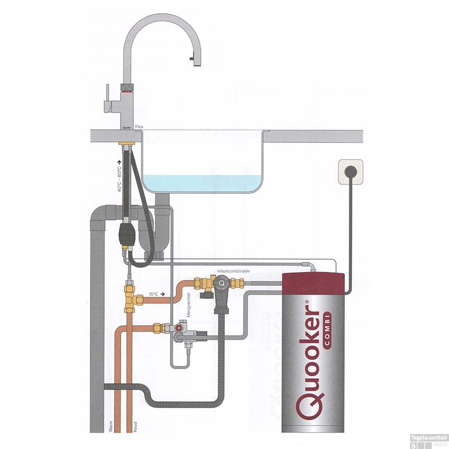 Bij de Combi alleen een koudwater leiding. Het vervolg hiervan is dat u beperkt bent in het gebruik van warm water. Omdat dit uit de Quooker boiler moet komen. Het voordeel is dat er alleen een koudwater leiding nodig heeft.