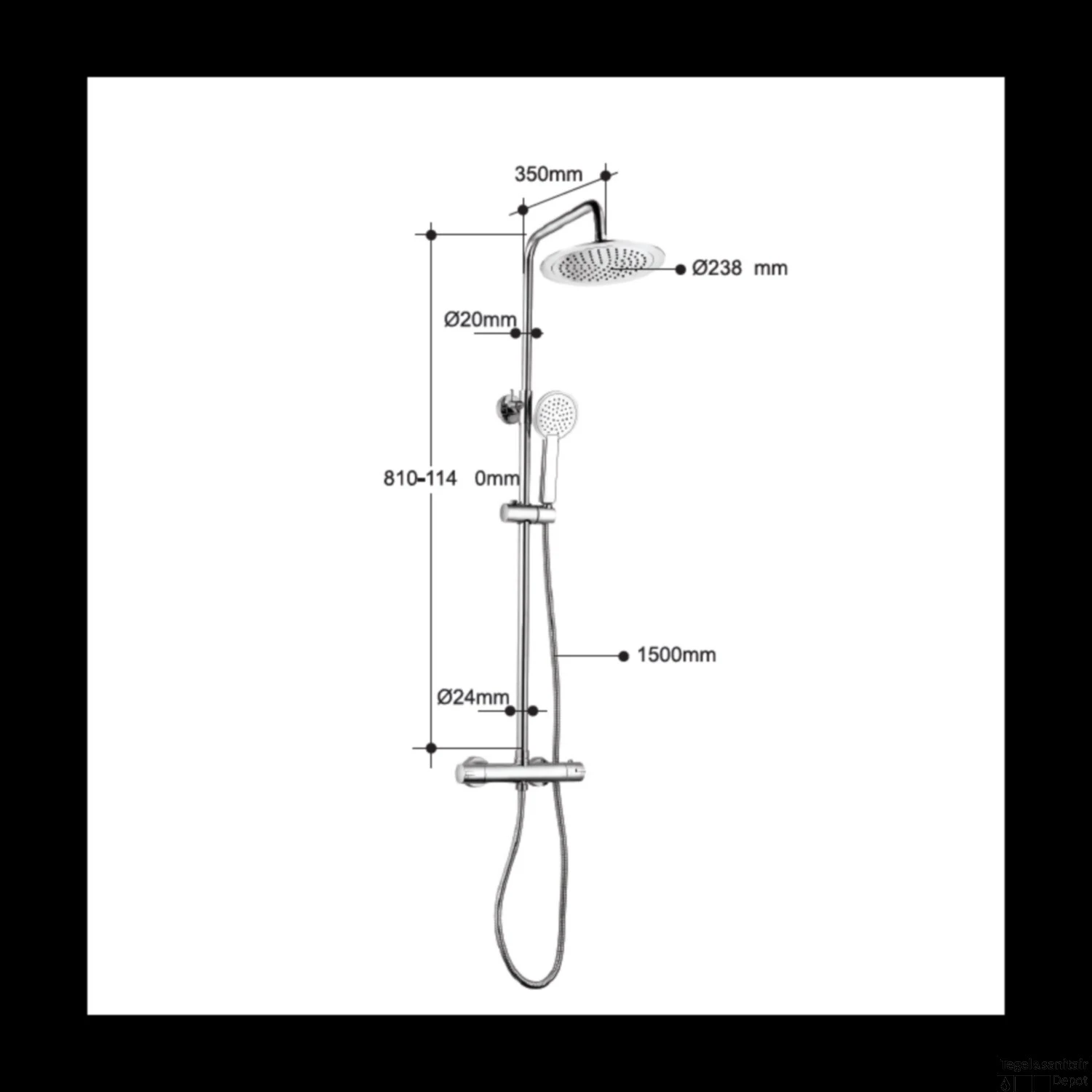 - – Diameter hoofddouche: 23,8 cm