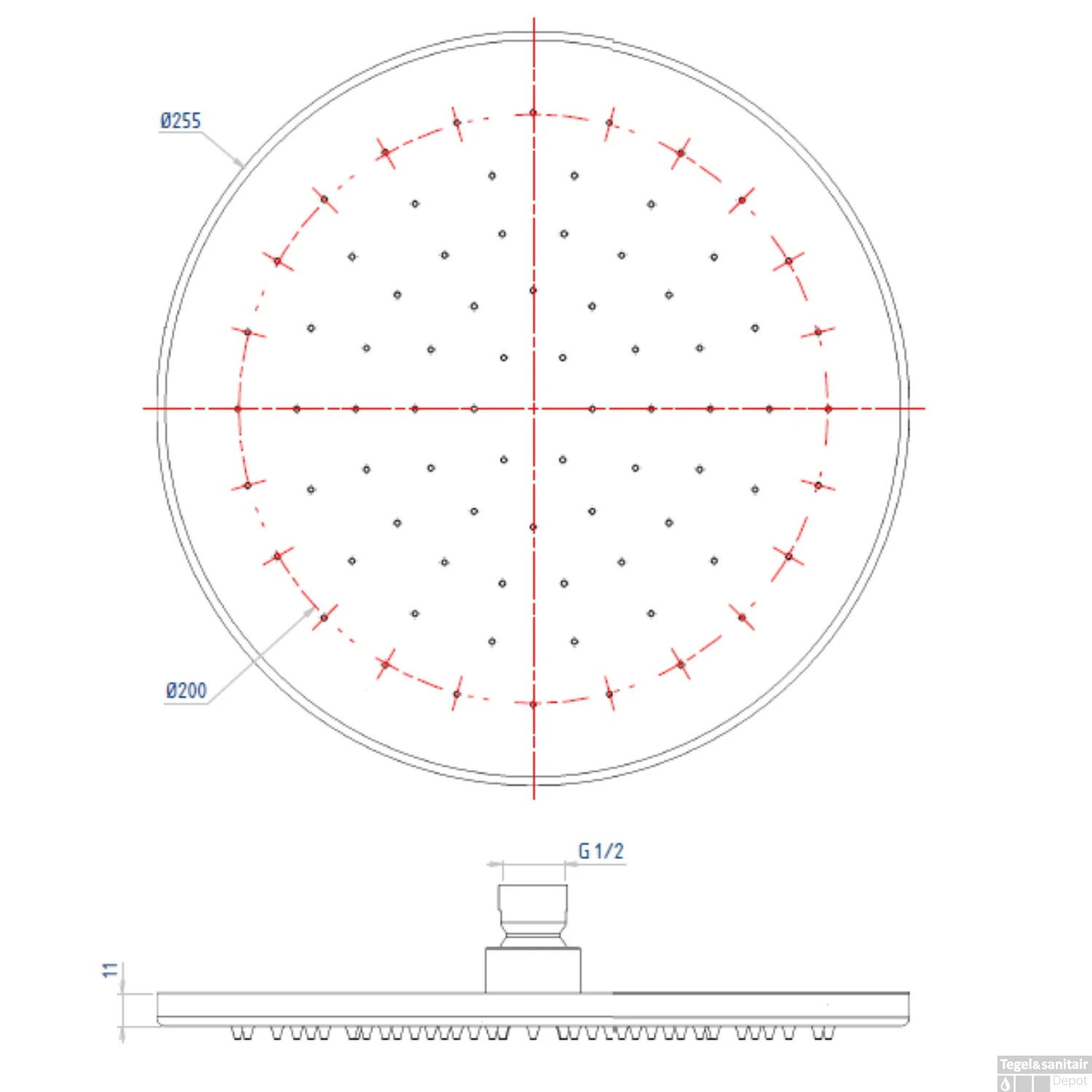 - Afmeting hoofddouche: 25.5 cm