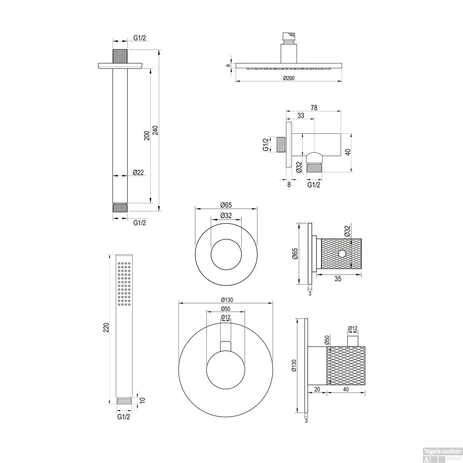 Specificaties Regendoucheset Inbouw Brauer Brushed Carving Thermostatisch 20cm met Plafondarm en Handdouche Staaf Geborsteld RVS: