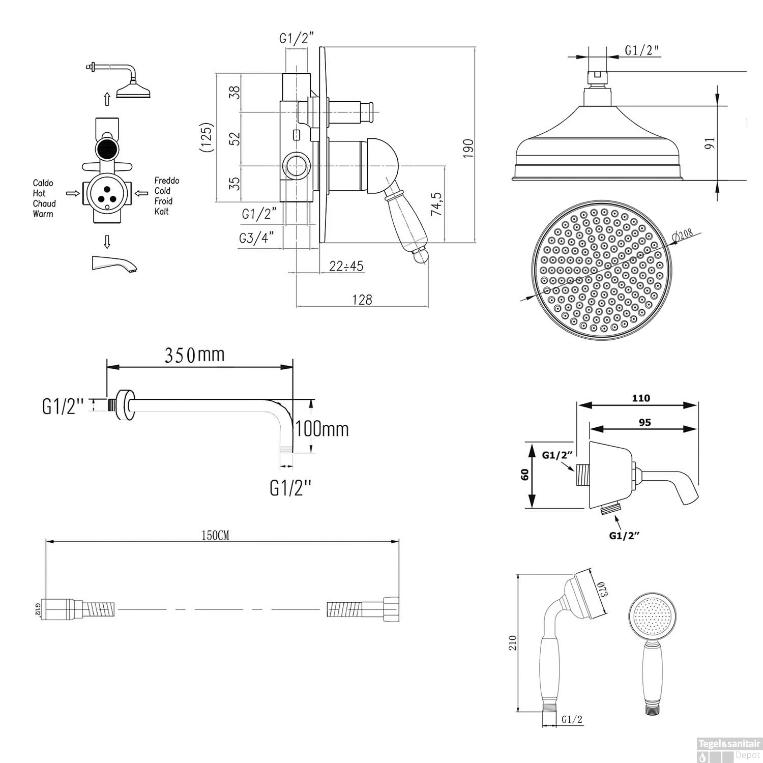 - Diameter handdouche: 7.3 cm