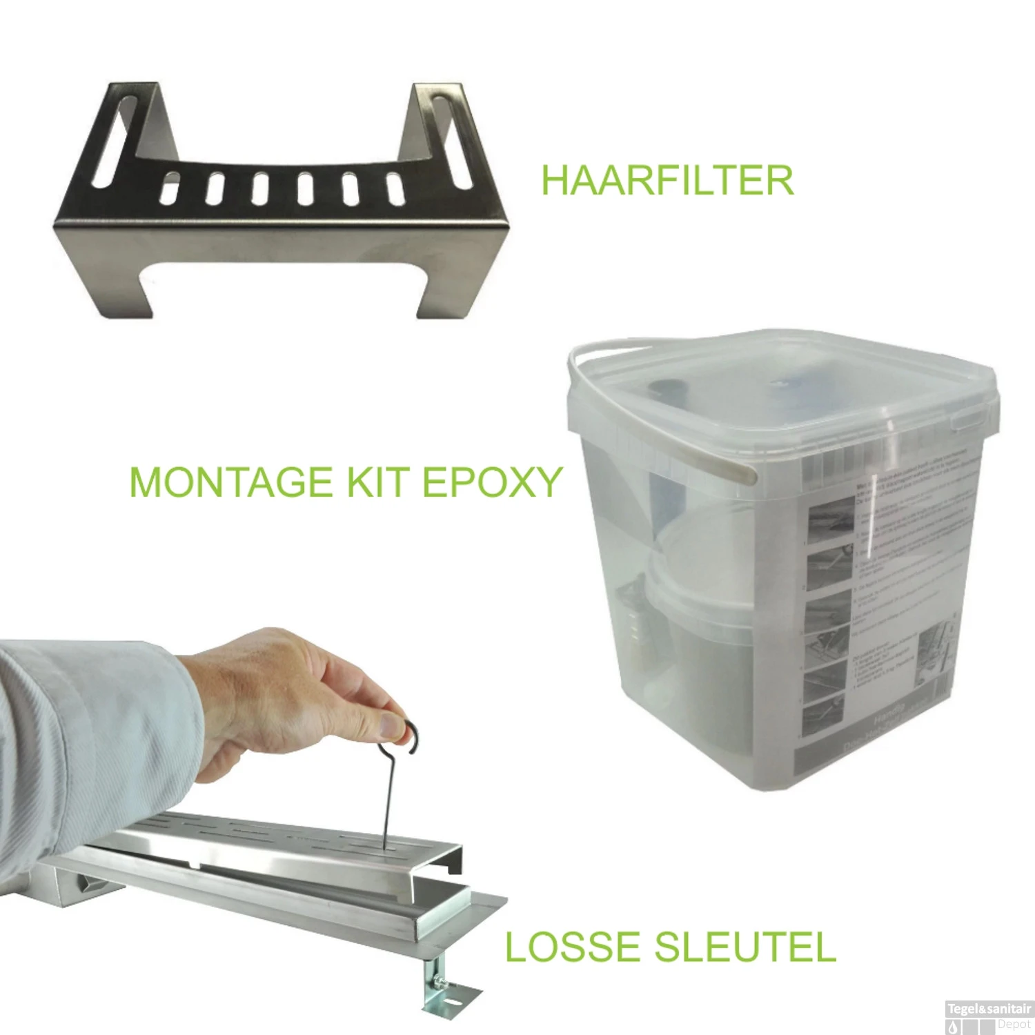 Bij de 90cm lange douchegoot wordt naast het tegelrooster, een standaard rooster meegeleverd. Daarnaast is het mogelijk om de douchegoot met tegelrooster uit te breiden met onderdelen voor het optimaal kunnen gebruiken van uw nieuwe douchegoot.(tegen een meer prijs)
