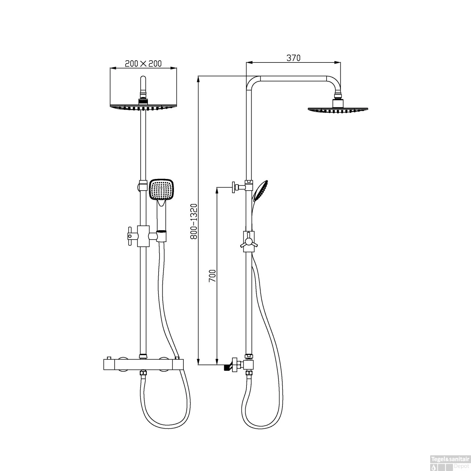 Afmetingen zijn 37×132 cm (lxh). Afmeting van de regendouche is 20×20 cm, hierbij heeft uw douchekop en regendouche een vierkante vorm.