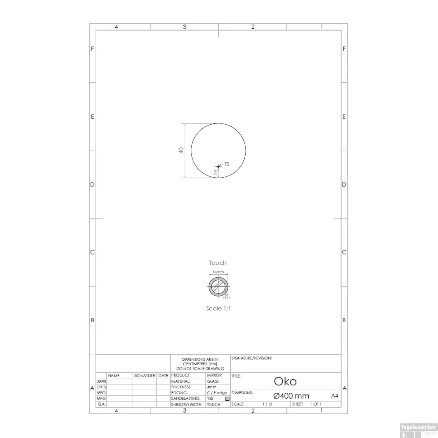De spiegel heeft een diameter van 40 cm en een glasdikte van 4 mm. Verder bevat de spiegel een touch knop waarmee u de verlichting eenvoudig kunt bedienen en is de spiegel voorzien van een knop voor geïntegreerde spiegelverwarming.