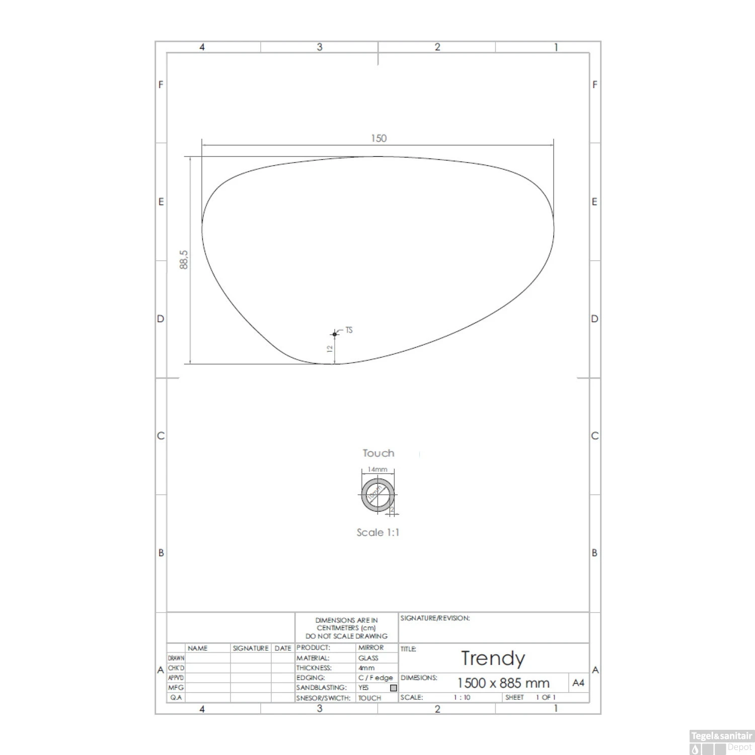 De spiegel is 150 cm breed, heeft een hoogte van 88.5 cm en een glasdikte van 4 mm. Verder bevat de spiegel een touch knop waarmee u de verlichting eenvoudig kunt bedienen en is voorzien van geïntegreerde spiegelverwarming.