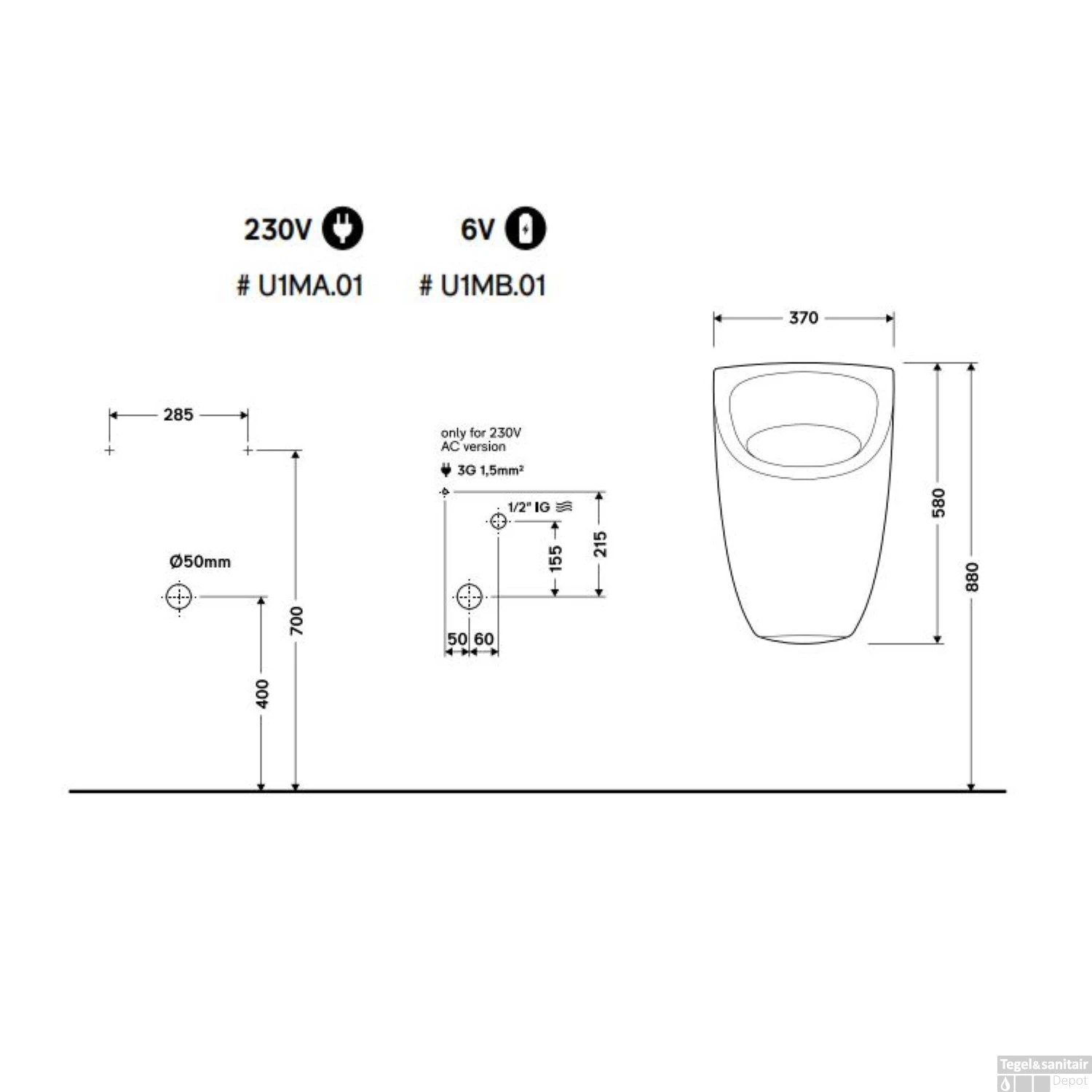 - Afvoeraansluiting: 50 mm