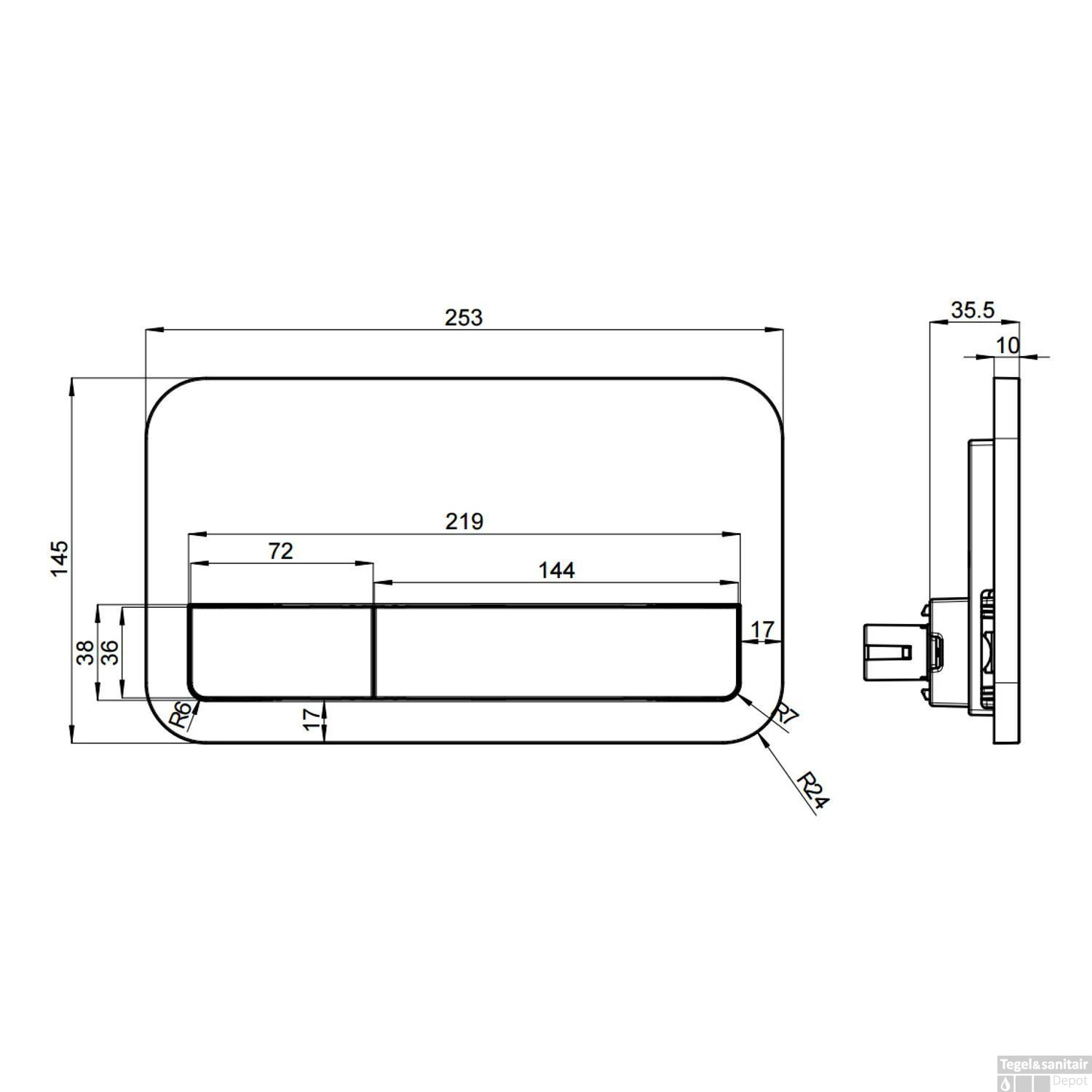 De rechthoekige twee-knops bedieningsplaat is voorzien van een waterbesparende 2-toets spoeling. De twee knoppen werken allebei apart. De grote knop is voor de grote spoeling en de kleine knop is dat automatisch voor de kleine spoeling. U kunt hiermee een hoop water besparen want u kiest per toilet bezoek zelf voor een grote of kleine spoeling.