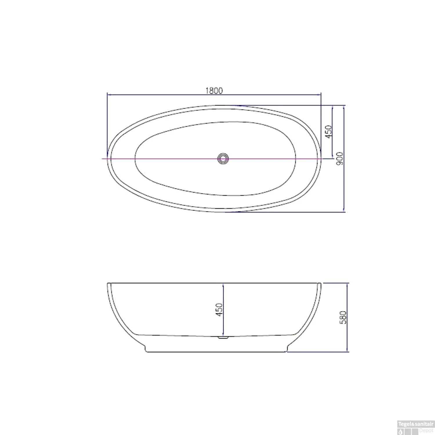 Het bad is 180cm lang en 90cm breed, genoeg om gezellig met zijn tweeën in te zitten. De afvoer zal niet in de weg zitten want die zit netjes in het midden. De rand van het bad is 3.5cm breed.