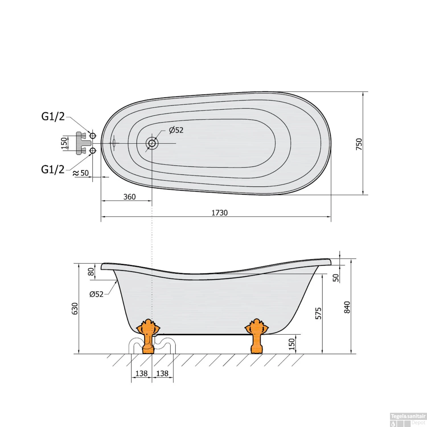 Specificaties Vrijstaand Bad 173x75x84 cm Wit met Leeuwenpoten Sapho Retro: