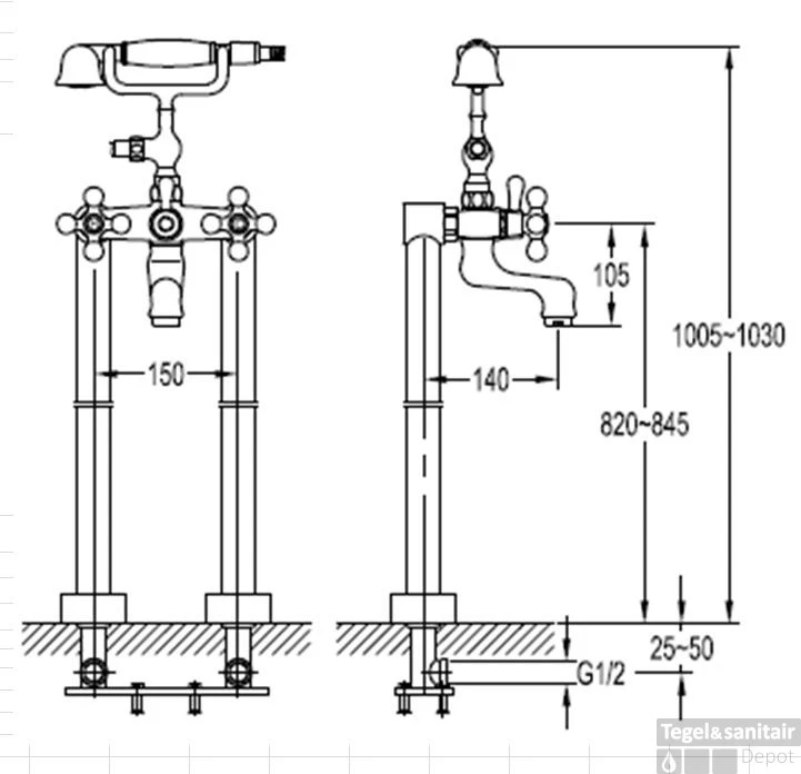 De vrijstaande badkraan is 100 cm hoog en heeft een hoh afstand van 21.5 cm. Door de bevestiging op de vloer zal dit een mooie combinatie zijn met een vrijstaand bad.