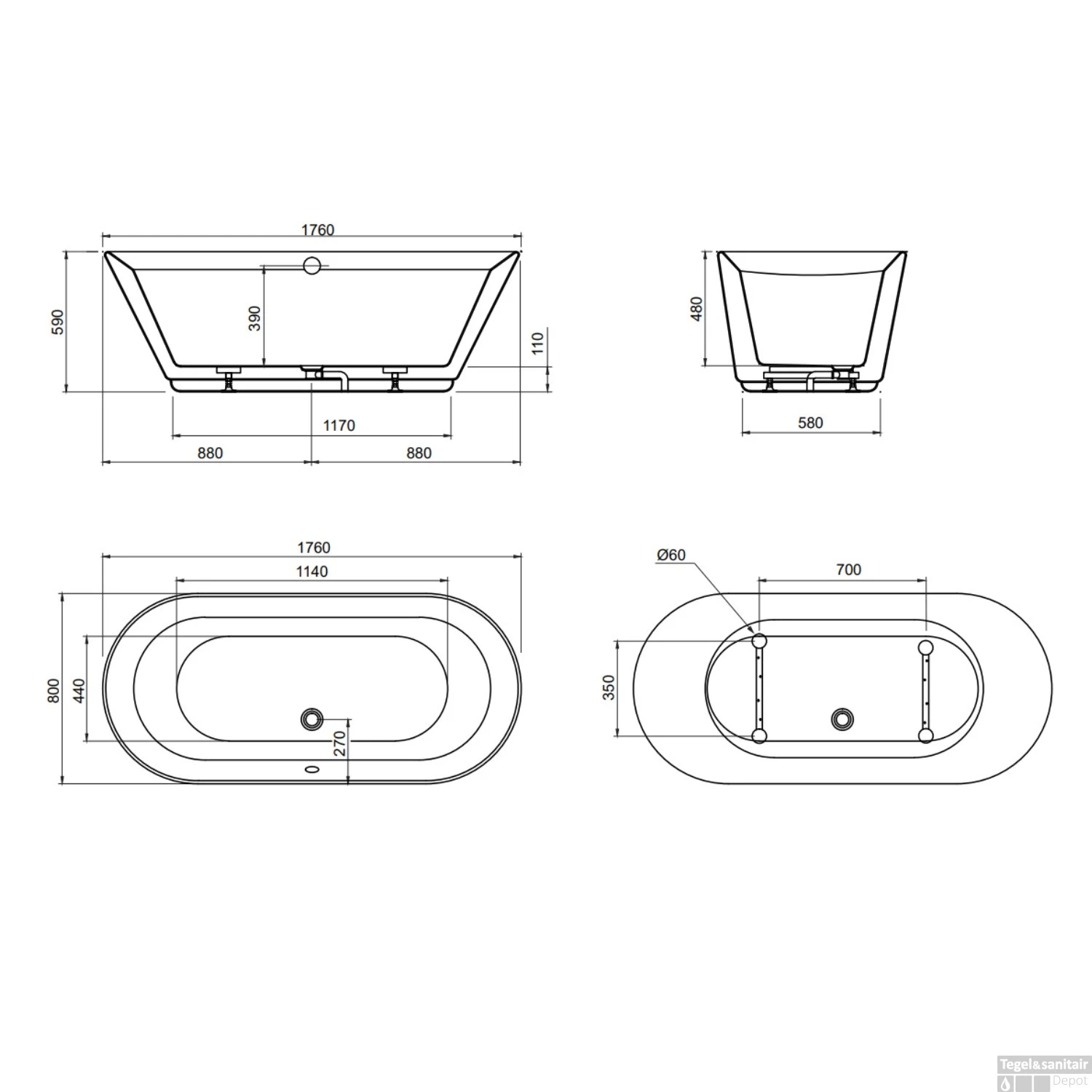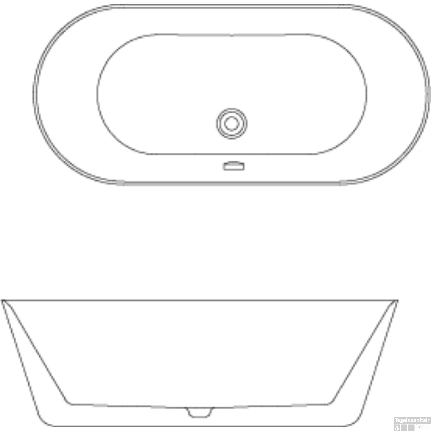De lengte van dit ligbad is 176 cm, de breedte is 80 cm en de hoogte zonder poten is 59 cm. De diepte van dit bad is 48 cm, de inhoud is 195 tot 265 Liter water.