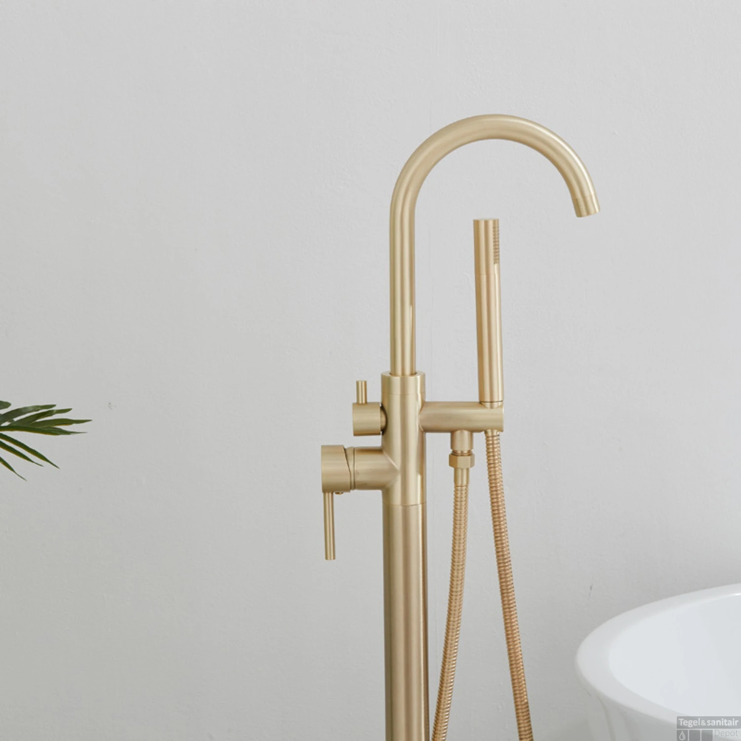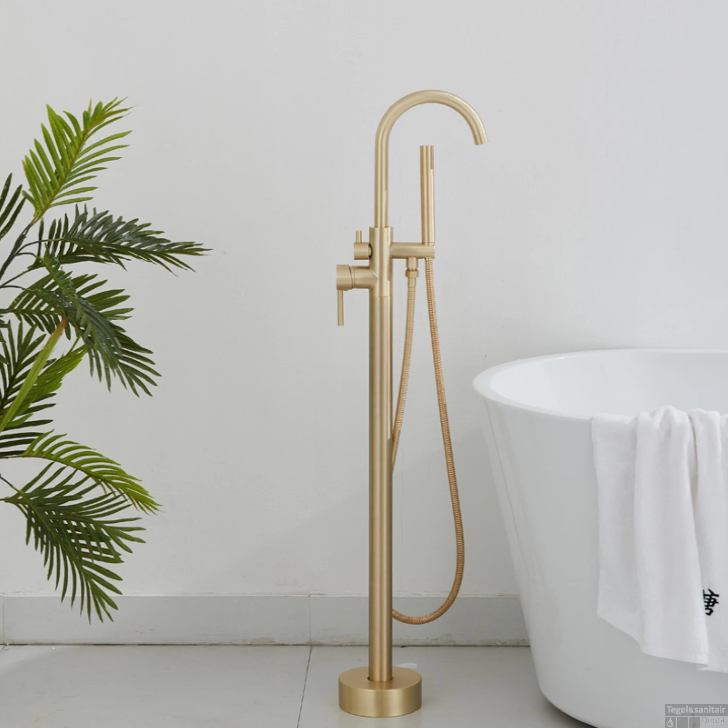 De Gold vrijstaande badmengkraan van het merk Boss & Wessing is vervaardigd uit messing in een mat gouden kleur, wat dit artikel een directe eye-catcher in uw badkamerruimte maakt. De vrijstaande badkraan is voorzien van een draaibare uitloop en wordt standaard geleverd inclusief een staaf handdoucheset. De kraan is voorzien van één hendel waarmee u zowel de temperatuur als de kracht van de waterstraal naar wens in kunt stellen. U kunt de vrijstaande badkraan uitstekend combineren met een vrijstaand ligbad in uw badkamer. Bovendien zit op deze kraan een fabrieksgarantie van liefst vijf jaar!
