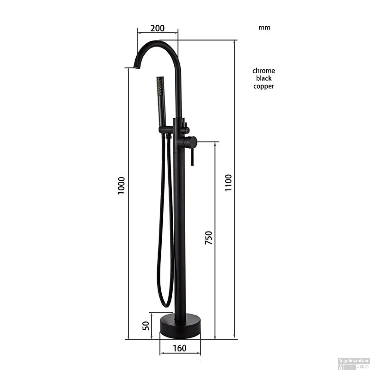 Specificaties Vrijstaande Badkraan Boss & Wessing met Zwarte Handdoucheset Messing Chroom: