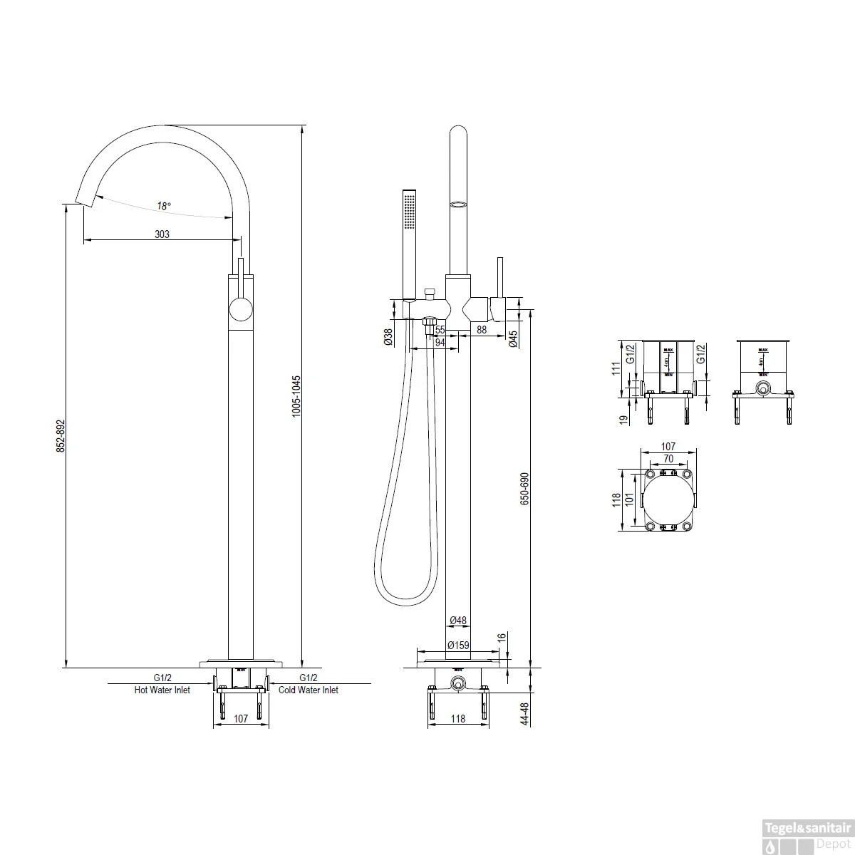 De Brauer vrijstaande badkraan heeft een hoogte van 100,5 cm. Bovendien is de kraan in hoogte verstelbaar tot en met 104,5 cm. De hoogte van de uitloop is 85,2 cm en deze heeft eveneens een verstelbaarheid van 4 cm omhoog tot en met 89,2 cm. De badkraan heeft een 1/2” aansluiting en een uitloop lengte van 30,3 cm.